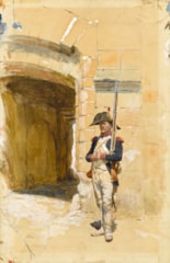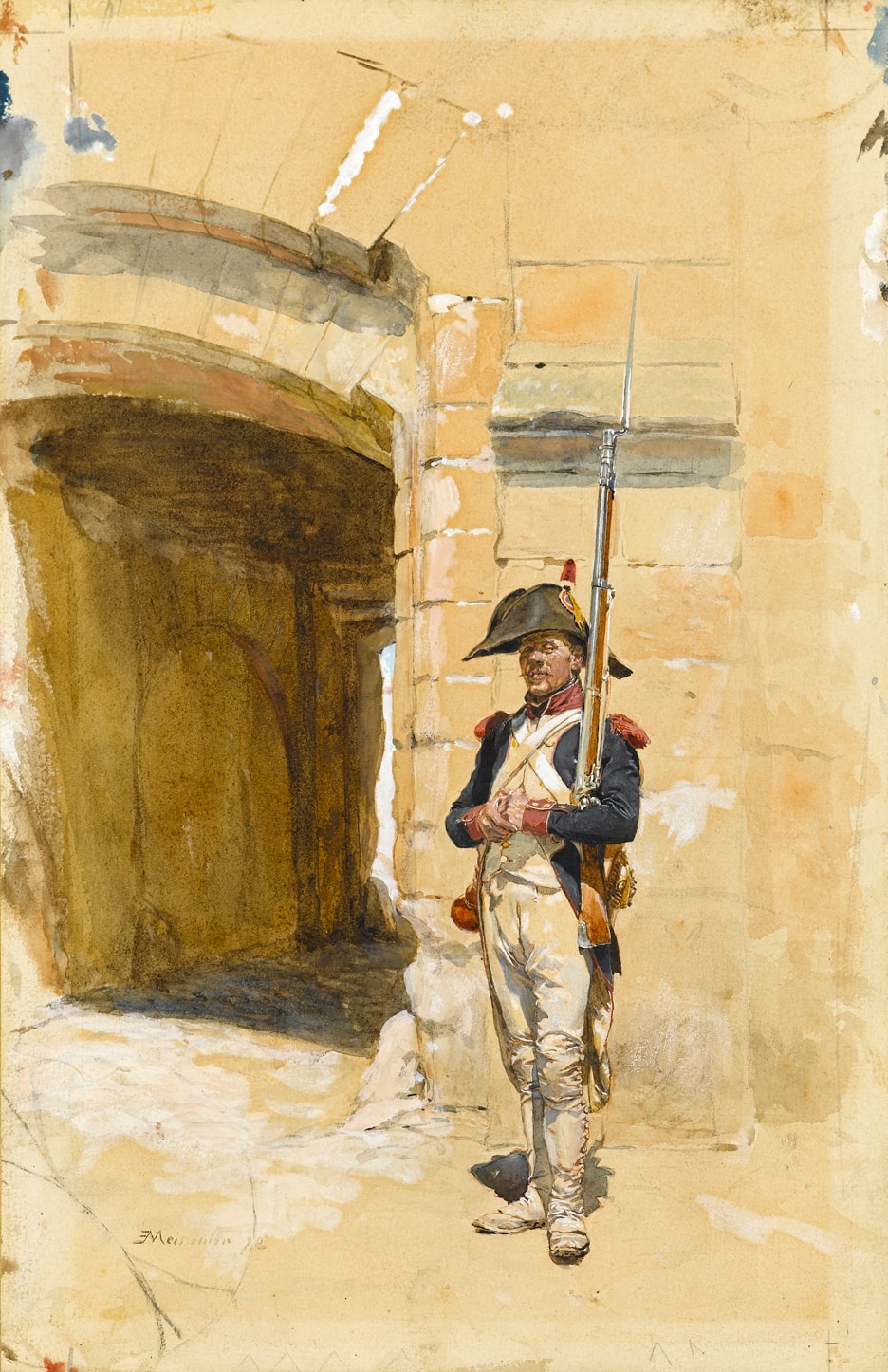The prominent archway behind the sentry in this drawing differs from the wall seen behind the figure in the finished painting. It appears, therefore, that Meissonier originally intended this sentry to be shown in front of the arched entrance gateway to the old abbey adjoining his estate at Poissy, which is visible, flanked by another sentry, in the left background of the painting.