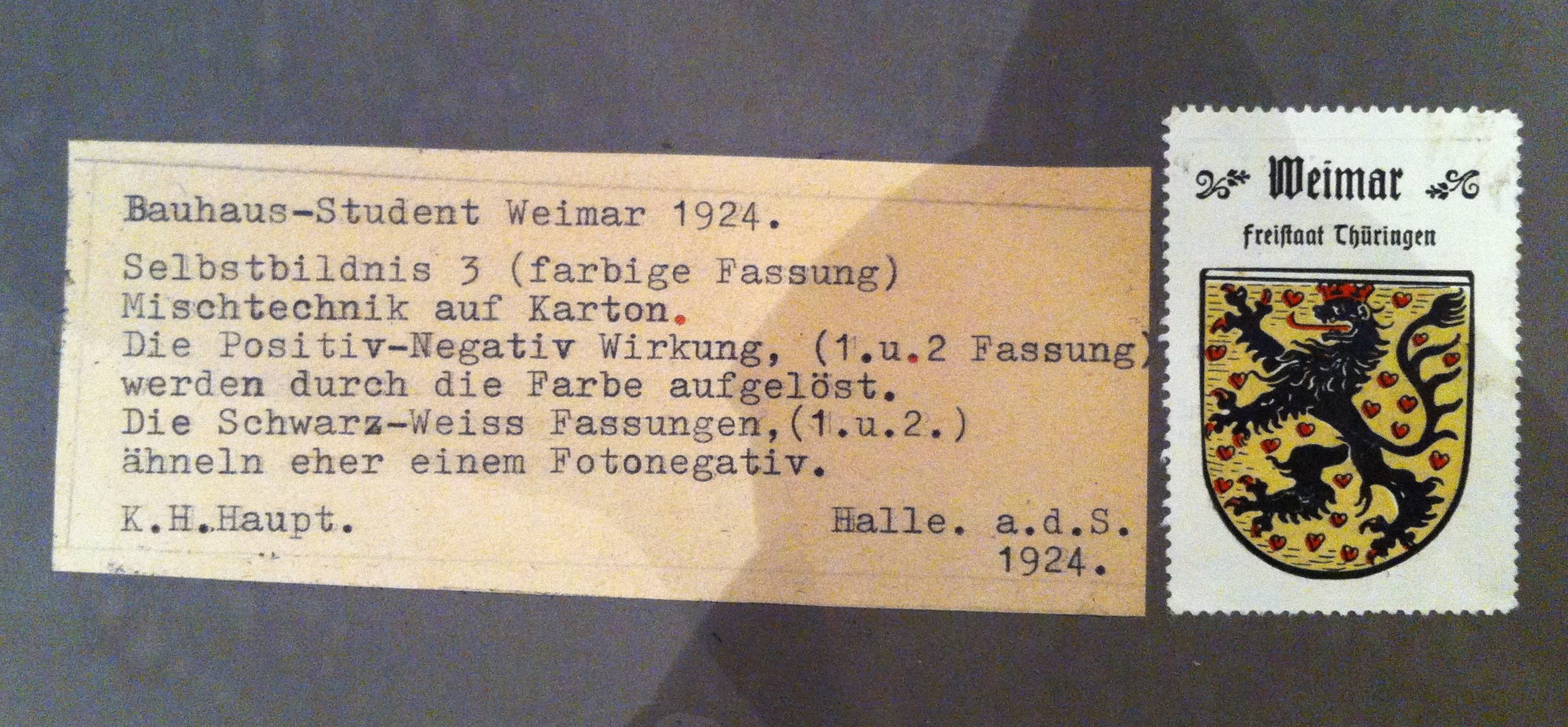 Inscribed Bauhaus-Student Weimar 1924. / Selstbildnis 3 (farbige Fassung) / Mischtechnik auf Karton / Die Positiv-Negativ Wirkung, (1. u. 2 Fassung) / werden durch die Farbe aufgelöst. / Die Schwarz-Weiss Fassungen, (1. u. 2.) / ähneln eher einem Fotonegativ. / K. H. Haupt. Halle. a. d. S. / 1924. on a typewritten label pasted onto the reverse.