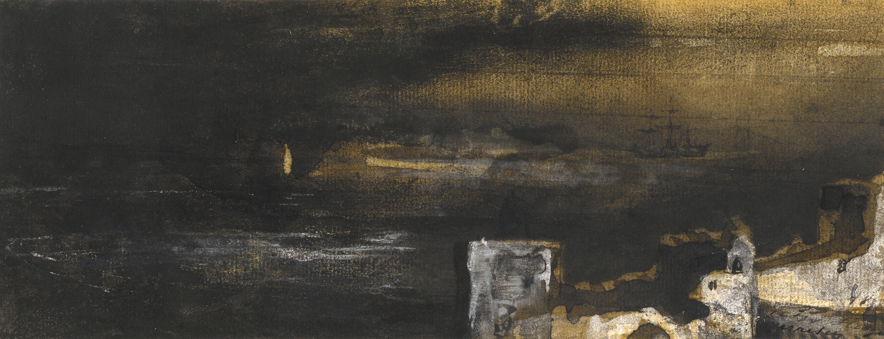 One scholar has noted of the drawings made by Hugo during his stay in the Channel Islands that ‘his visual world became enriched almost to the point of obsession with the spectacle of the sea. But this grandiose, monotonous horizon never changed. As a result, the graphic work moved further and further away from the real in an attempt to catch the kaleidoscope of sea, rock and cloud, or to reflect the ebb and flow of an imaginary world in which shapes could form and dissolve in an instant.’2 Even after his return to Paris in 1870, Hugo continued to visit Guernsey, and to produce drawings inspired by its bold and dramatic landscape.