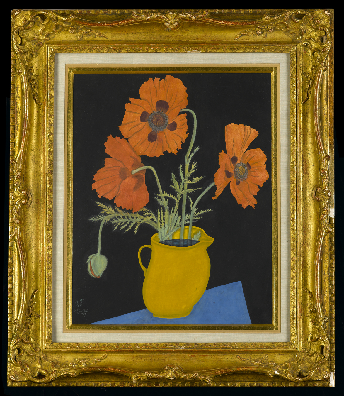 Still life compositions of flowers account for a relatively small but choice part of Foujita’s oeuvre. A stylistically comparable drawing of a vase of roses, also dated 1917, appeared on the art market in London in 2003, while a watercolour and gouache study of flowers in a vase, similarly datable to 1917, is in a private collection. Among other gouache and watercolour drawings of floral still life subjects from the same year are a Vase of Flowers, sold in Paris in 1989 and a large study of Peonies, which appeared at auction in 2008.