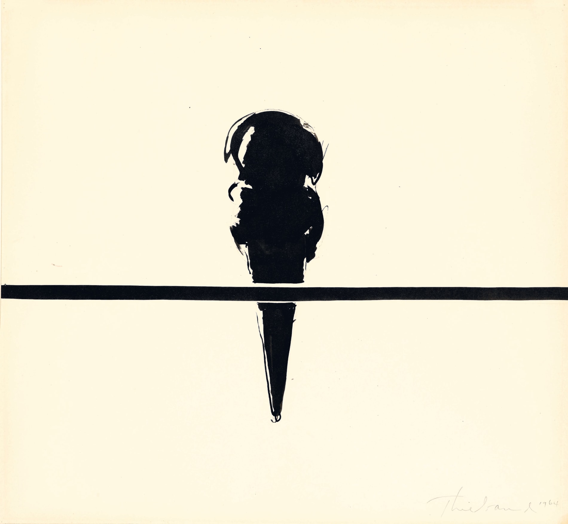 Ratcliff’s comments on a pen and ink wash drawing of Candied Apples of 1964 may equally be applied to the present sheet, drawn the same year: ‘an image made of stark white and nearly unmodulated black...[the] harsh tonal contrast invites us to see the apples bathed in the flourescent light that fills so many of Thiebaud’s paintings of food. Subtlety is to be seen in nuances of the quick, improvisatory brush marks...’