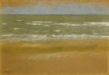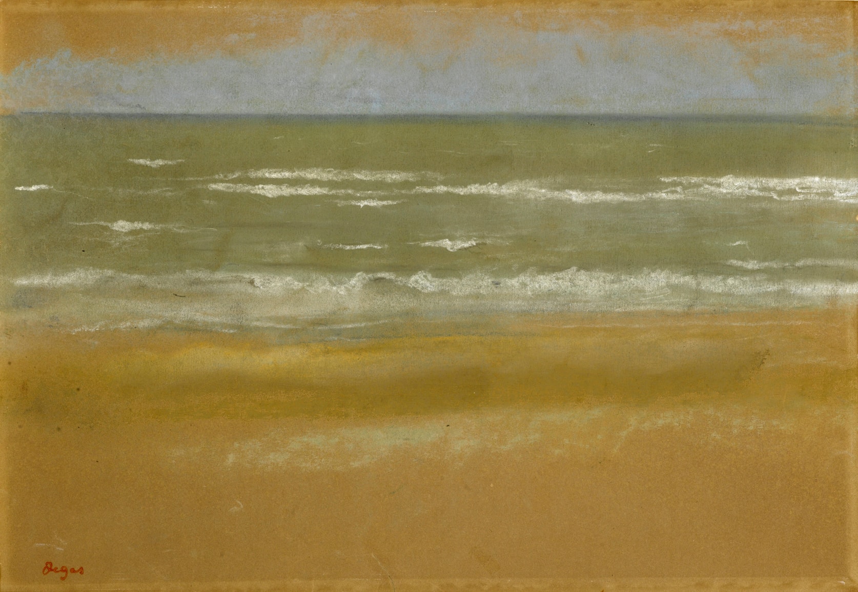 With the artist looking out to sea, the precise location of this pastel cannot be determined, as is the case with almost half of the forty-odd pastels drawn in 1869. A recent description of a similar seascape from the same series, today in the Musée d’Orsay, may equally be applied to the present sheet: ‘in this seascape Degas worked with pastel lightly and openly...Using the warmth of the paper as an additional color that gives body to the sea in the foreground and suggests the inevitability of sand under our feet, he seems to have limited himself to four sticks of pastel: a white, a black, a blue, and a blue green. The buff visible through the strokes of blue green in the sea make it appear greener still. On the other hand, the blue in patches of the sky is intense...But the greatest subtlety is his emphasis on the horizon...’ Among other comparable beach scenes from this 1869 group of pastels is a Seascape, with Beach at Low Tide in the collection of the Albertina in Vienna.