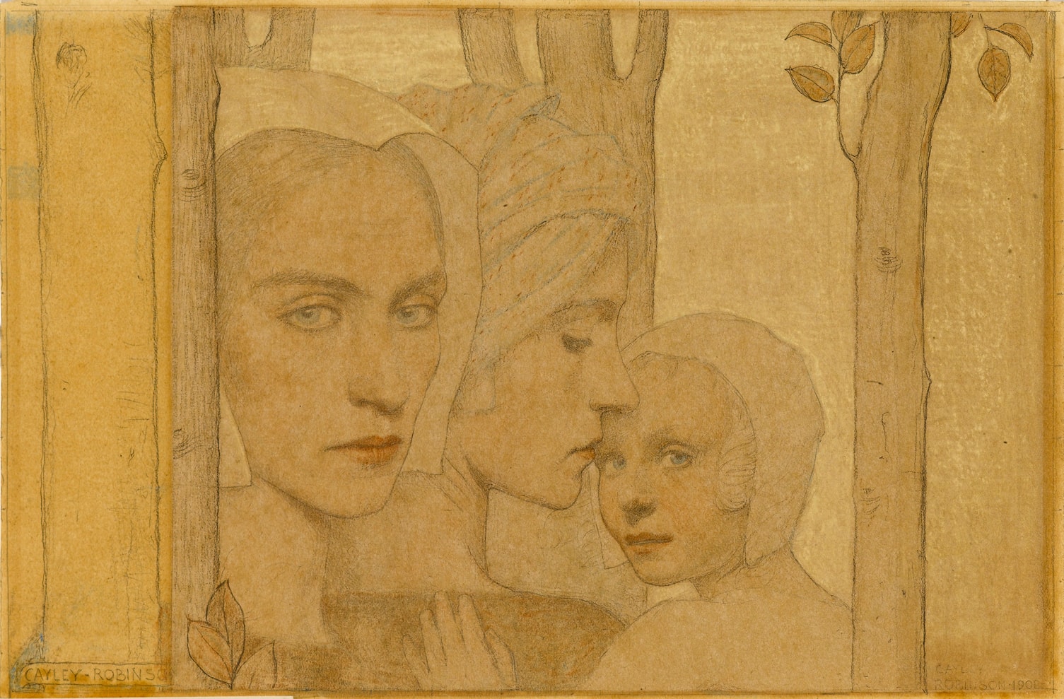With some differences, the poses and arrangement of the three figures in this drawing are repeated in two larger, finished compositions by Cayley Robinson, one of the same year and the other drawn several years later. The group appears at the lower right corner of a large tempera painting entitled Reminescence, also dated 1908, which was formerly owned by artist’s friend Cecil French and is today in the collection of the Leamington Spa Art Gallery and Museum, while a later variant of the composition is found in a gouache drawing entitled The Renunciants, dated 1916, in the Victoria and Albert Museum in London.