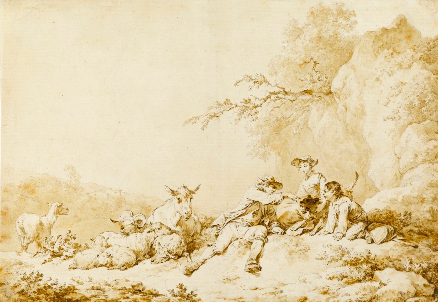 This large pastoral landscape may be dated to between 1772 and 1774, in the early years of the artist’s time in England. Its composition reflects the influence on the young Loutherbourg of Dutch 17th century painters such as Nicolaes Berchem. It is not a study for a painting but was in all likelihood intended as a finished work of art in its own right. Nevertheless, the drawing may be compared with a number of paintings of a similar pastoral theme and composition by the artist that are datable to the period before he settled in England, such as a canvas known as The Enterprising Shepherd, which was on the art market in Paris in 2009.