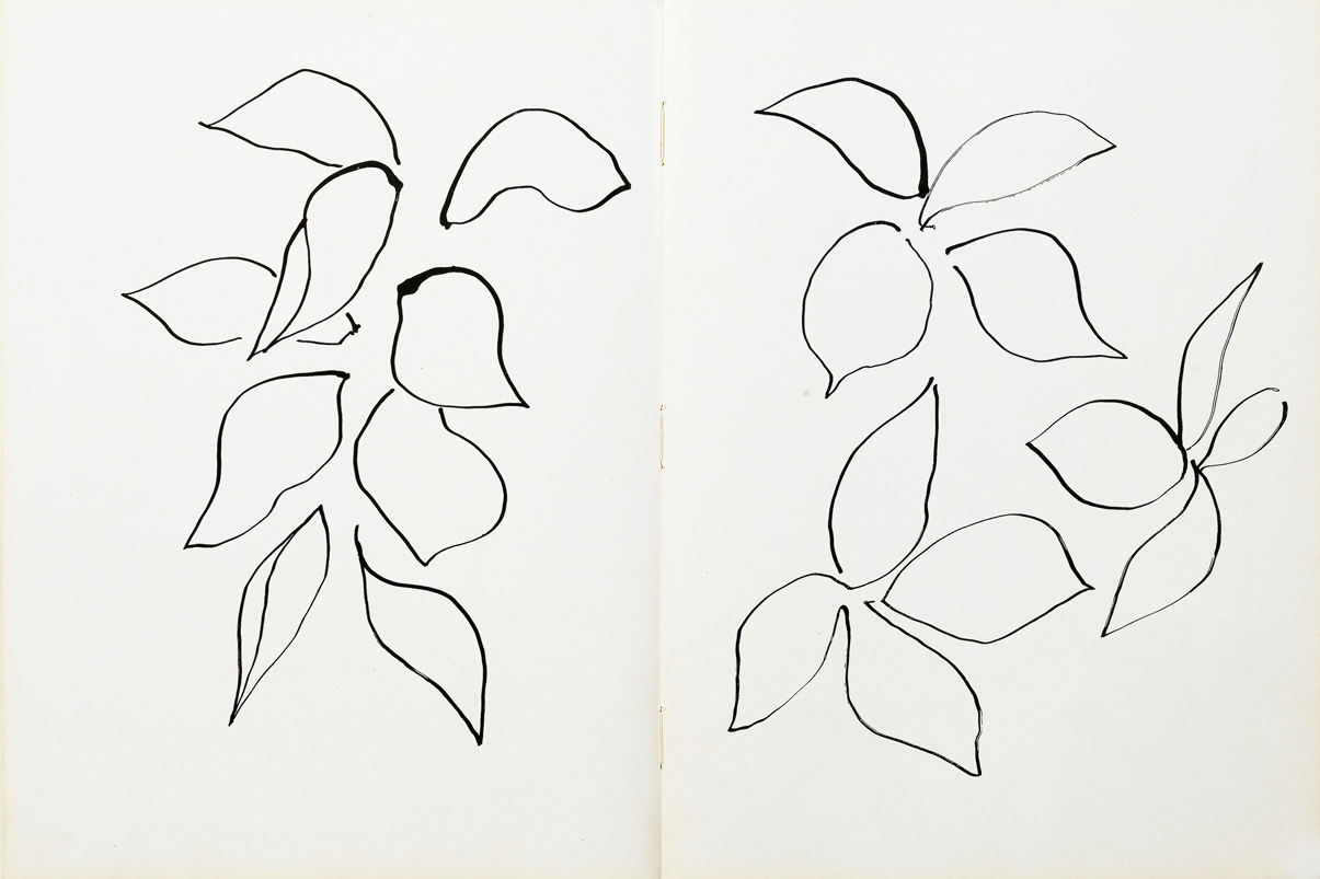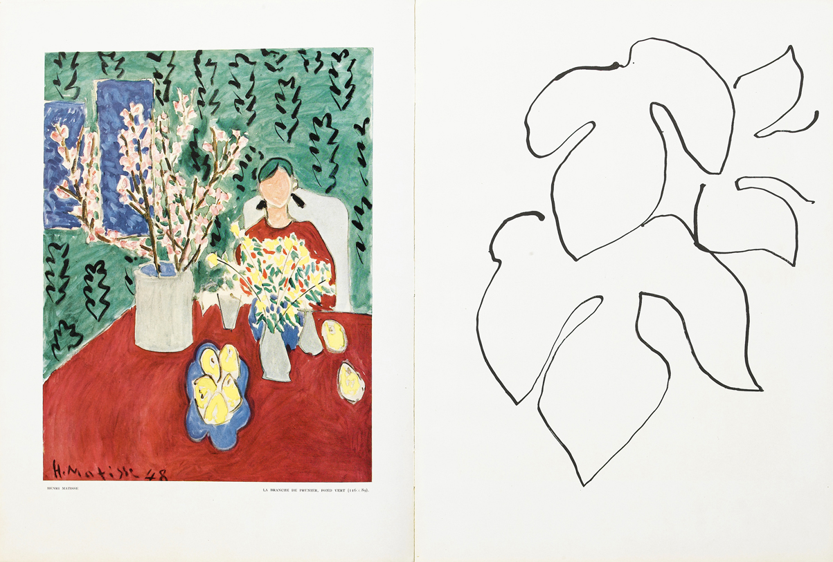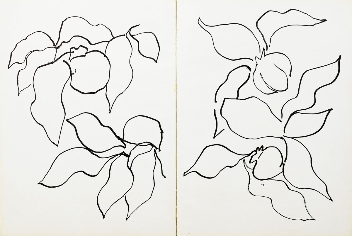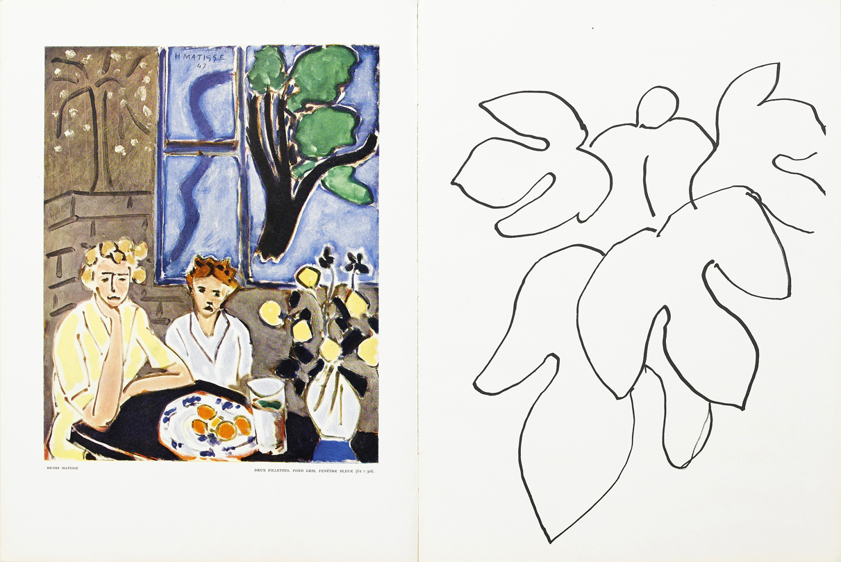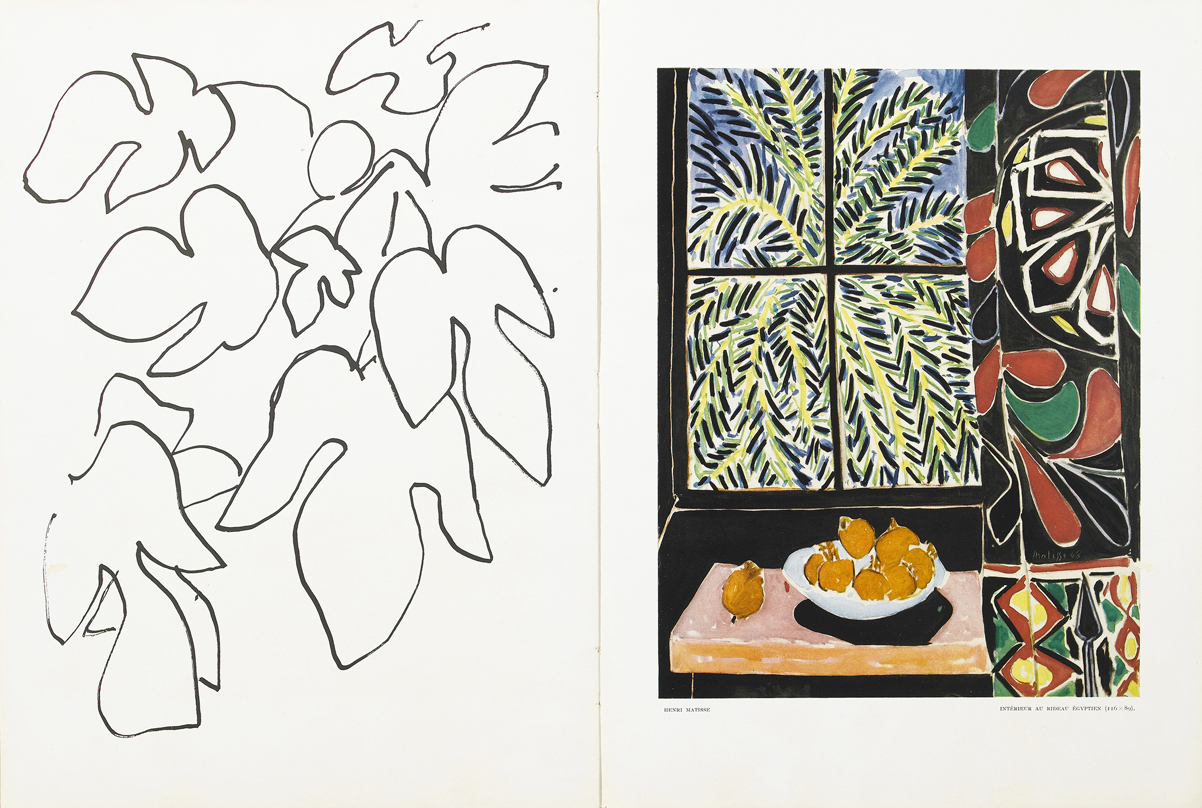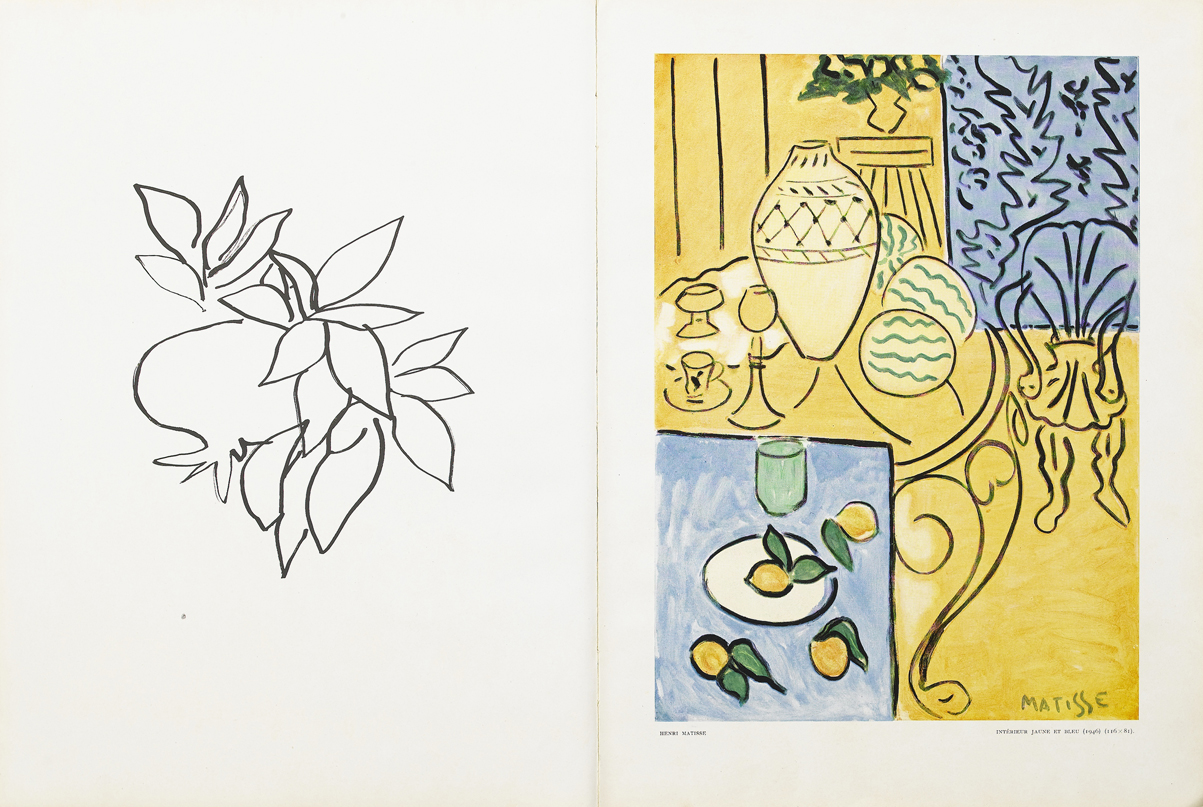 Matisse and Tériade had collaborated on a previous issue of Verve, published three years earlier, in November 1945, with the title De la Couleur. The success of that project led Tériade to devote another entire issue of the magazine to Matisse’s recent work. As Michel Anthonioz has written, ‘The project got under way while Tériade was spending Christmas of 1947 at Saint-Jean-Cap-Ferrat. The paintings strewn about Matisse’s studio and house were important enough (and there were enough of them) to fill an issue of Verve. Apparently, Matisse was quite willing to round out reproductions of his work with line drawings he would do in his garden and in the garden of Tériade’s Villa Natacha. Pomegranates, acanthus leaves, oranges and orange-tree leaves, ivy leaves cast on white pages, provide this issue with a rhythmic “breathing” and act as interstitial tissue between the paintings. These line drawings, done quickly without corrections, were repetitions of a single motif. Matisse drew them while sitting in his wheelchair; often the work was physically taxing. Today they strike us as spiritual, an ascesis of the eyes.’