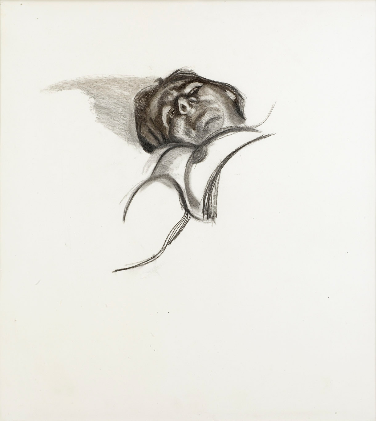 Drawn in 1989, this large drawing may be related to a series of paintings and etchings by Freud of reclining male and female nudes of the later 1980’s and early 1990’s. As one modern scholar has noted of these nudes, ‘Freud’s Naked Portraits are his most disturbing and subversive works. His figures are shown reclining on a bed or sofa, often either asleep or in a state of introspection or reverie, in strange, unflattering poses that are nevertheless often natural to the way they sleep or relax by themselves. Commonly viewed from an unusual vantage point, the angular limbs, foreshortened faces, and tortured body language…rebuke the tradition of the ideal nude.’