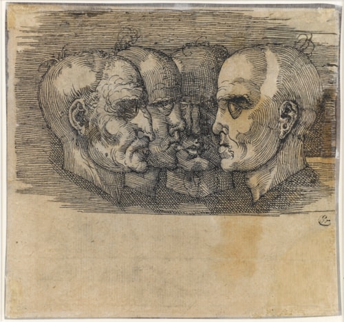 Drawings by Sebald Beham are relatively uncommon. Only a few may be related to his prints, and the present sheet is one of these. Both sides of this fine drawing are preparatory studies for two woodcuts used as illustrations for Das Kunst und Lehrbüchlin Sebalden Behams, a treatise on design and draughtsmanship written and illustrated by Beham. First published by Christian Egenolph in Frankfurt in 1546, the book was illustrated with twenty-six woodcuts by Beham; it proved very popular, and was reprinted several times until an eighth edition in 1605. The related woodcut of the putto with a flaming urn in the Kunst und Lehrbüchlin is signed with Sebald Beham’s monogram and dated 15463. A stylistically comparable drawing by the artist of a putto holding a sickle and a bunch of grapes, dated 1542, was formerly in the Edmund Schilling collection and is today in the British Museum. The woodcut of the four male heads is signed with the artist’s monogram, but undated. It is also inscribed Hie sihest du die vier angesichter ausgemacht und abgesetzt mitt / scharpfierung und schatten ausserhalb der linien reiß sie nach (‘Here you see the four faces which are offset with shading and shadows trace them outside of the lines’) in letterpress above the image. In the Kunst und Lehrbüchlin the woodcut follows another, related print of the same subject of four heads drawn within a single grid, but without hatching. Thirteen of the twenty woodcuts in the 1546 drawing manual are also studies of heads, and indeed Beham’s interest in expressive heads can also be seen in his earliest known drawing, a sheet of studies of eight heads, dated 1518, in the collection of the Herzog Anton Ulrich-Museum in Braunschweig.