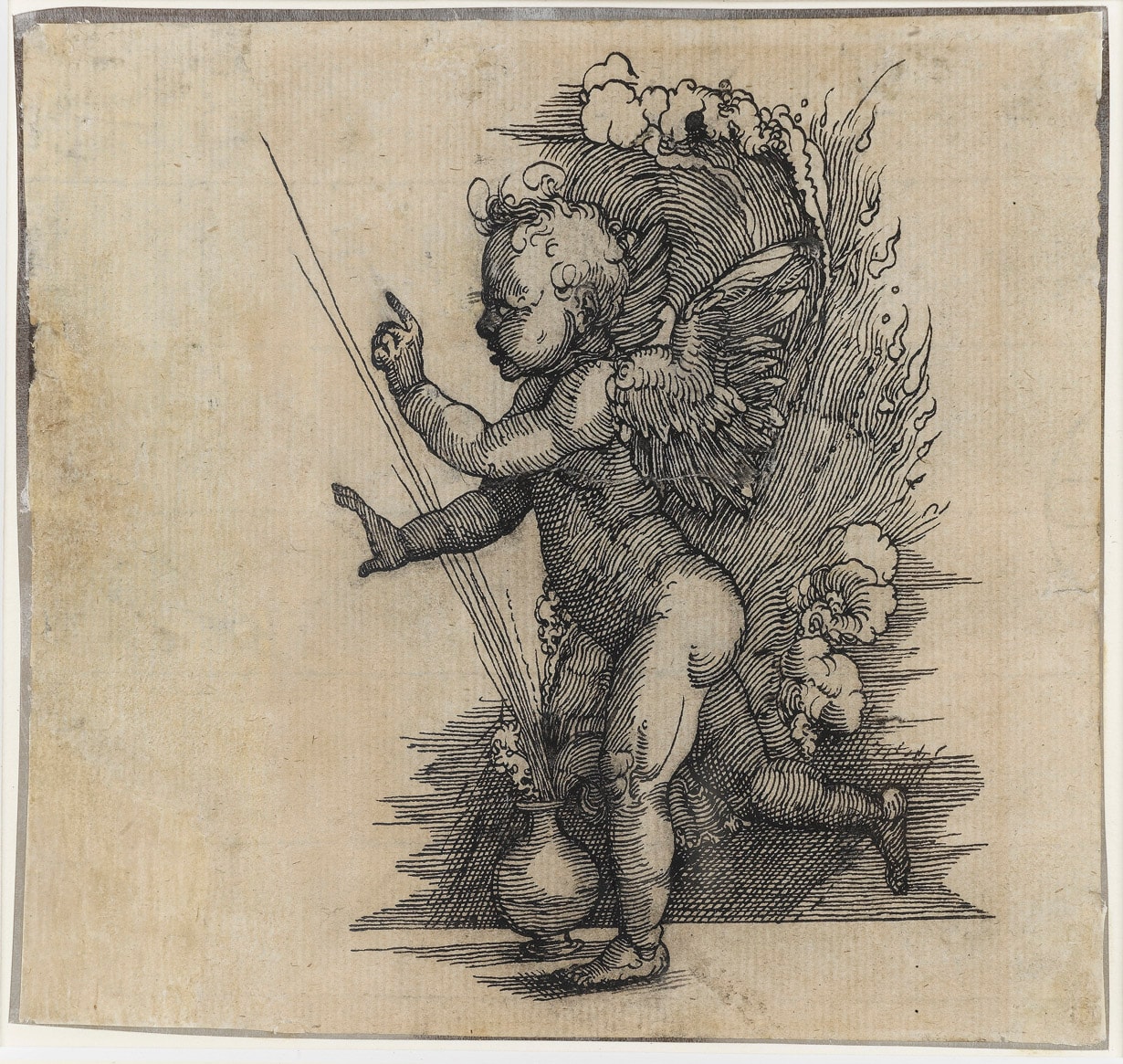 Although the drawings on each side of the present sheet are in the same direction as the woodcuts and slightly larger in scale, the several slight differences between them, as well as the evident pentimenti (particularly visible in the right hand of the putto), point to the fact that this double-sided drawing is an autograph study for the two Kunst und Lehrbüchlin woodcuts. The attribution of the present sheet to Sebald Beham has been further confirmed by Dr. Matthias Mende and Dr. Kurt Löcher.
