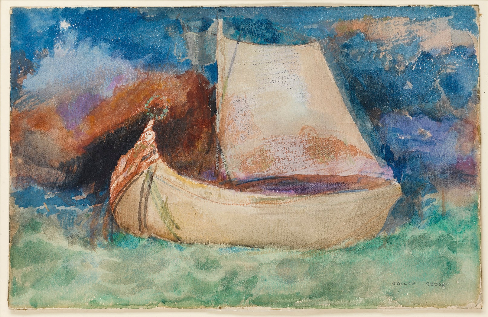 Redon treated the theme of boats on a calm sea in several pastels and watercolours. The sea was of great importance for Redon, and boats seem to have had a particularly peaceful, almost comforting association for the artist. As he wrote, ‘Beautiful, peaceful ships, gently lifted by the eternal wave, you float in a friendly harbor. Your long leaning masts and their thin ropes strike the depth of the foggy sky and the breath of the air and the rhythm of the waves cradle the spirit like a gentle harmony…Beautiful, gentle ships; so dear to the sailor, what do you carry in the depth of your skiff? From the bosom of the Ocean, to the immortal source, fishing, treasure, the catch was so great. And the breath of the air, and the rhythm of the waves cradle the spirit like a gentle harmony. Oh sea, oh great friend!’ However, Redon seems also at times to have regarded a sea voyage as a metaphor for a passage through the dangerous realm of the unconscious.