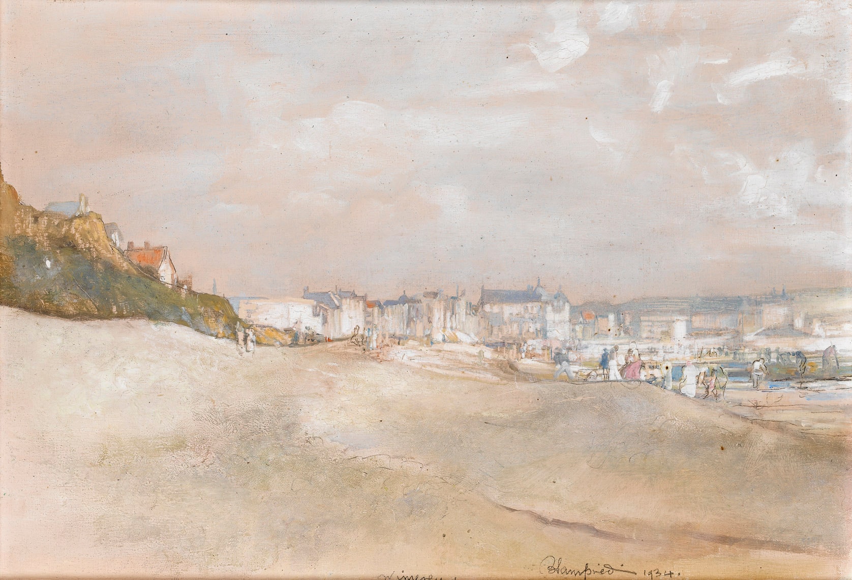 This appealing picture may be included among a series of a landscapes painted on small wooden panels by Blampied, several of which - including views of Wimereux, Knokke in Belgium, Zefeld in Austria, St. Brelade in Jersey and elsewhere – were included in the Cleveland exhibition in 1941. Blampied visited the small port of Wimereux (or Vimereaux), near Boulogne in the Pas-de-Calais, several times in the 1930’s, often staying with his friend, the writer and journalist Cecil Hunt.