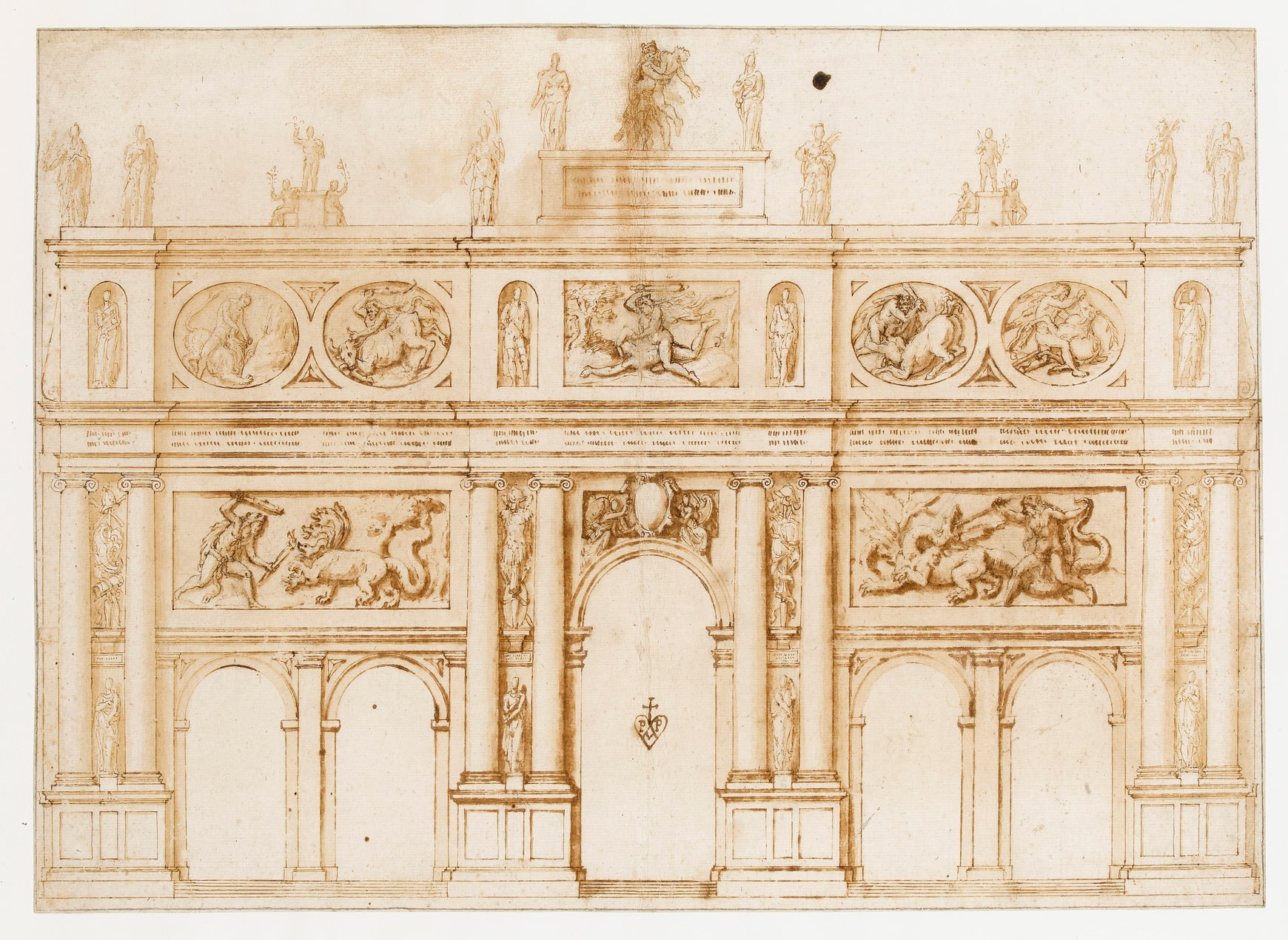 The present sheet can also be related to another drawing by Pedemonte, possibly for the same project, which was sold at auction in 1997 and is today in the collection of the Palazzo Te in Mantua. That drawing, which shares the same provenance as the present sheet, was identified as a design for a triumphal arch erected near San Silvestro in Mantua, on the occasion of the entry of King Henry III of France and Poland into the city on 2 August 1574. The entire decoration called for a total of eight temporary arches, had to be erected within a fortnight, as it was not until late July that the citizens of Mantua learned of the planned visit. While the author of the 1574 decorations is unknown, it would be logical to assume that Pedemonte, as one of the leading architects in Mantua, would have been entrusted with this important commission. While the present sheet may have been part of the same decorative scheme, the presence of scenes from the labours of Hercules would also suggest the possibility that the drawing might have been related to an architectural commission linked to Cardinal Ercole Gonzaga.
