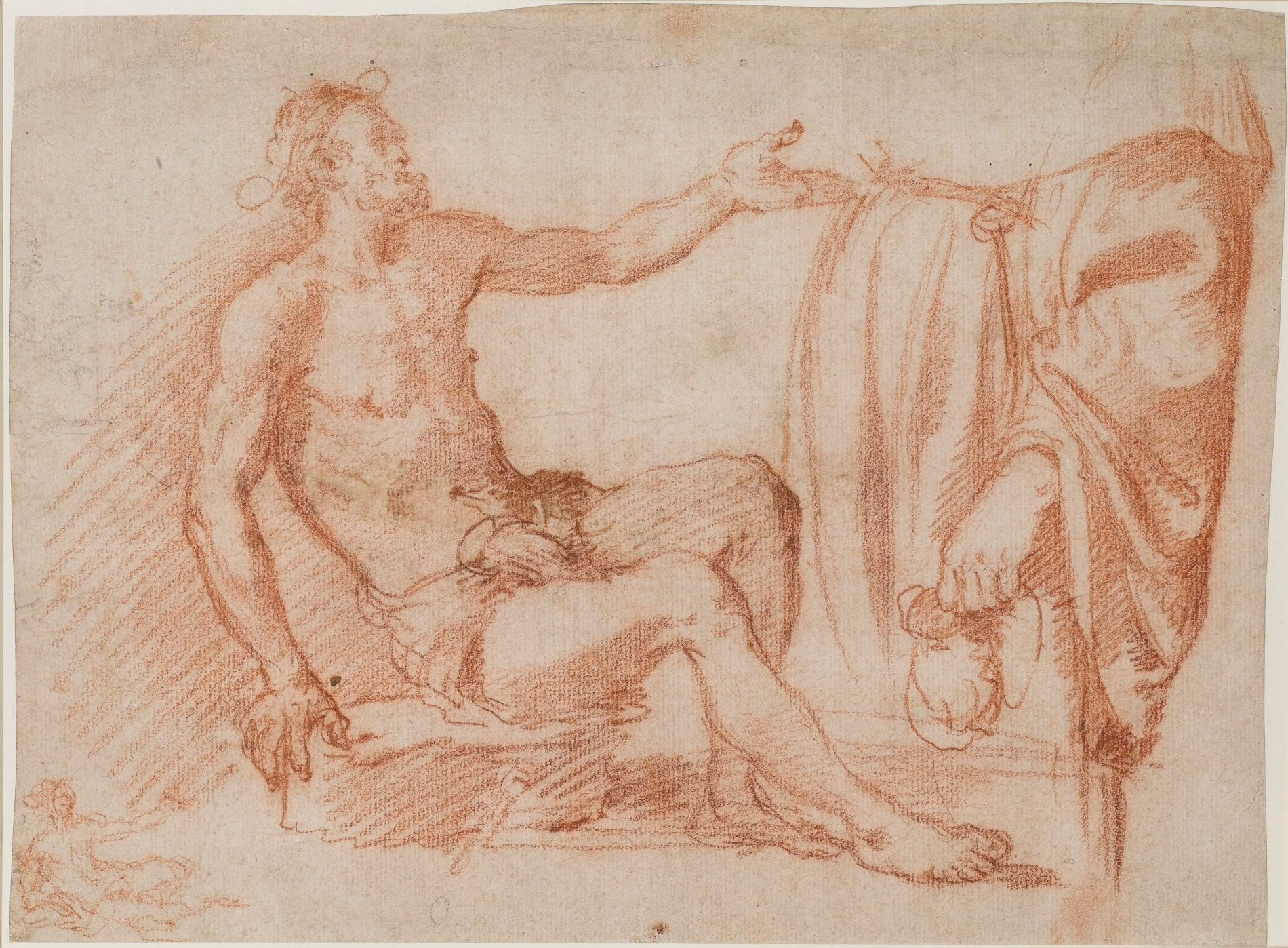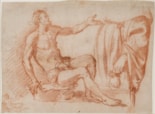 Three further studies by Confortini for the figure of the beggar are known. Two of these are in black chalk; a drawing at Christ Church in Oxford and another on the London art market in 1934 and now in the British Museum. The British Museum drawing shows the beggar with his right arm raised, while the Christ Church study, like the present sheet, depicts the figure with a raised left arm. (The position of the legs of the beggar in the present sheet, however, differ from that shown in the other two studies.) A third, more sketchy study of the same figure, drawn in red chalk, is in the Biblioteca Marucelliana in Florence. All of these drawings by Confortini may be dated to around 1631, as they are stylistically comparable with his drawings for the lunettes painted that year for the refectory of Santa Trinità.