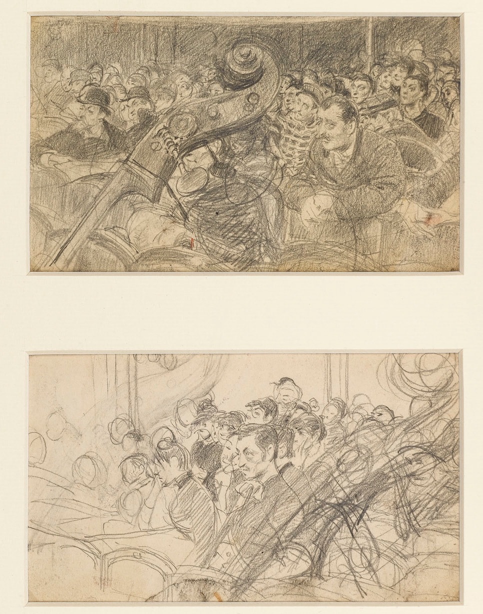 These various sketches and studies - in pencil, pastel and oil - culminated in a large finished pastel of c.1886, today in a private collection. In each of these works, Boldini focuses his attentions not on the performance itself or the musicians, but on the characters in the audience, viewed from an unusual vantage point in a manner akin to some of the theatre paintings of his friend Degas.
