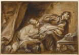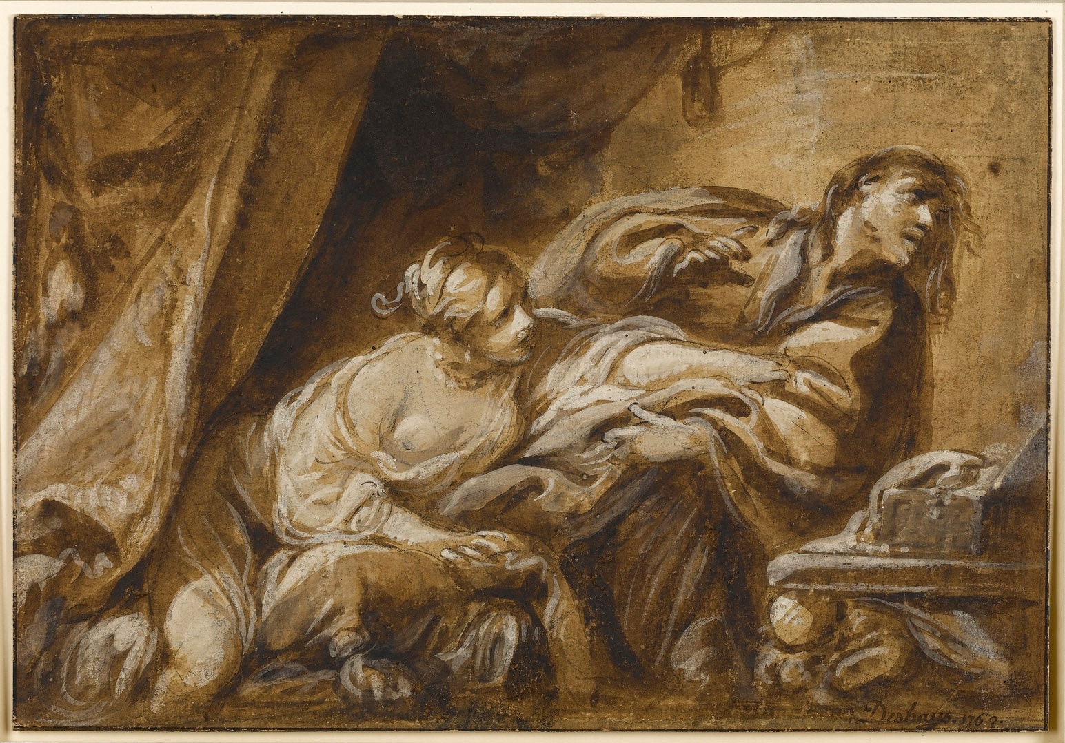Around six hundred drawings were dispersed at the posthumous sale of the contents of Jean-Baptiste Deshays’ studio, probably including the present sheet which, with its vigorous handling of the pen and brush, is a fine example of the artist’s bold draughtsmanship. Deshays is known to have exhibited two paintings of the Old Testament subject of Joseph and Potiphar’s Wife, both of which are now lost. The first of these is a youthful work shown at the Ecole des Elèves Protégés in 1751; described as ‘la femme de Putiphar, accusant Joseph’, it may have depicted a different episode in the story from that shown in the present sheet. Dated 1762, this drawing is instead a preparatory study for a later painting of La Chasteté de Joseph, exhibited by Deshays at the Salon of 1763 and in the Seroux d’Agincourt collection by 1769. The painting was widely admired in reviews of the 1763 Salon, with Diderot lavishing particular praise: ‘Si l’on me donne un tableau à choisir au Salon, violà le mien; cherchez le vôtre. Vous en trouverez de plus savants, de plus parfaits peut-être; pour un plus séduisant, je vous en défie.’