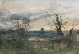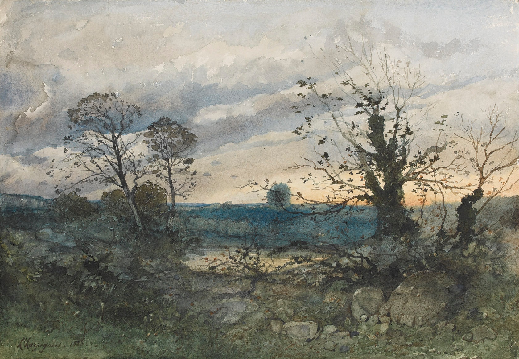 Harpignies developed a particular speciality of landscape drawings in watercolour, a medium he mastered early on. Watercolour drawings accounts for many of the artist’s finest works, and were the basis of his reputation, particularly outside France. (As a contemporary English critic, writing in 1905, noted, ‘one ventures to prophesy that the day will come, if it has not already arrived, when the water-colours of M. Harpignies will be prized even more dearly than his paintings in oils. As an aquarellist M. Harpignies is practically without a living rival in his own country...’). Harpignies exhibited his first watercolour landscapes at the Salon of 1864, where they were praised by the critic Théophile Thoré, and in later years exhibited at both the Société des Aquarellistes Français in Paris and the British Watercolour Society in London. The freshness and luminosity of his watercolours soon gained him a wide audience, and led to his taking on a number of private pupils. Harpignies’ reputation as a watercolourist spread to England, and he was invited by Whistler to exhibit at the Royal Institute in London, From the early 1900’s onwards, he began to substitute charcoal for watercolour, and his drawings take on a silvery-grey tonality that is perhaps indicative of his failing eyesight. Nevertheless, Harpignies maintained an emphasis on a distinctive manner of tonal landscape, inspired by Corot, in the paintings and drawings that he produced well into the early years of the 20th century.