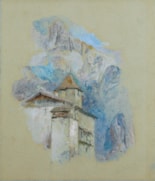 This drawing was, in fact, previously identified as a view of Fribourg in Switzerland, and indeed the drawing is close in style to Ruskin’s views of Fribourg dating from the mid- to late 1850’s, such as a two studies of The Towers of Fribourg and Houses at Fribourg in the British Museum and a drawing of The Augustinian Convent in Fribourg in the David Thomson collection in Toronto; the latter two drawings are, like many of the artist’s Swiss views, on blue paper. Such watercolours as the present sheet have been suitably described as ‘Elegant delineations of buildings, mountains and skies [which] were composed with almost oriental fastidiousness within expanses of blank paper, and the effect may be as cool as moonlight or as hot as Mediterranean sunshine.’