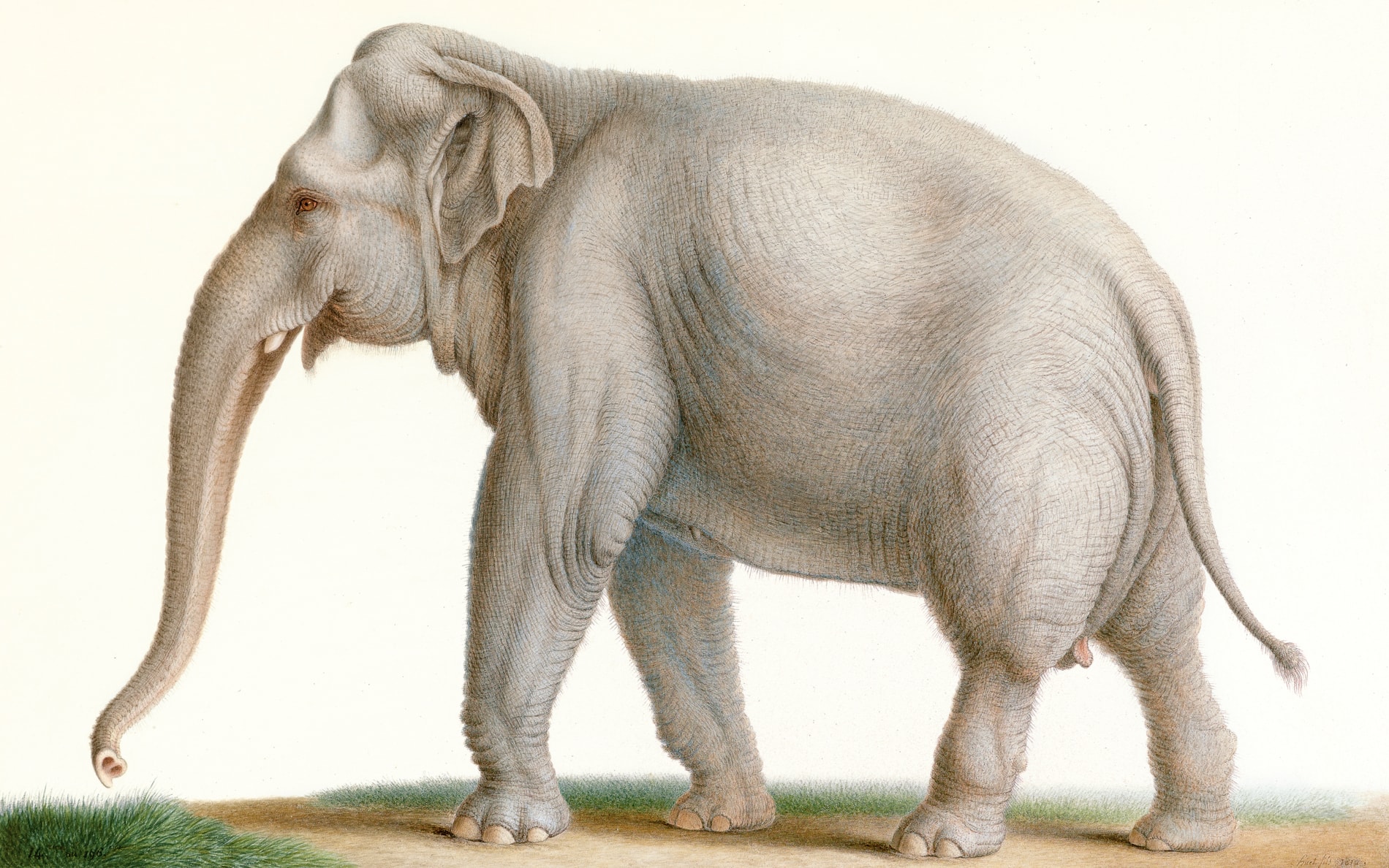 The Indian elephant (Elephas maximus indicus) is native to mainland Asia, and is smaller than African elephant. Nicolas Huet made this drawing at the menagerie of the Muséum d’Histoire Naturelle, part of the Jardin des Plantes in Paris.
