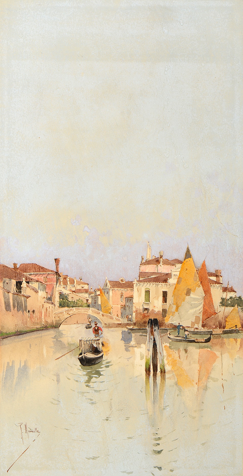 Mainella exhibited his work frequently in Venice, notably at the Biennale of 1897, as well in Berlin, Munich and Brussels. In 1901 he was invited by Count Robert de Montesquieu to mount an exhibition of his watercolours in Paris, and later was made an honorary member of the Société des Aquarellistes. Among the artist’s most important patrons was the American collector George Smith, who was in Venice between 1884 and 1886, and who assembled a collection of nearly fifty of his works, now in the collection of the George Walter Vincent Smith Art Museum in Springfield, Massachusetts.