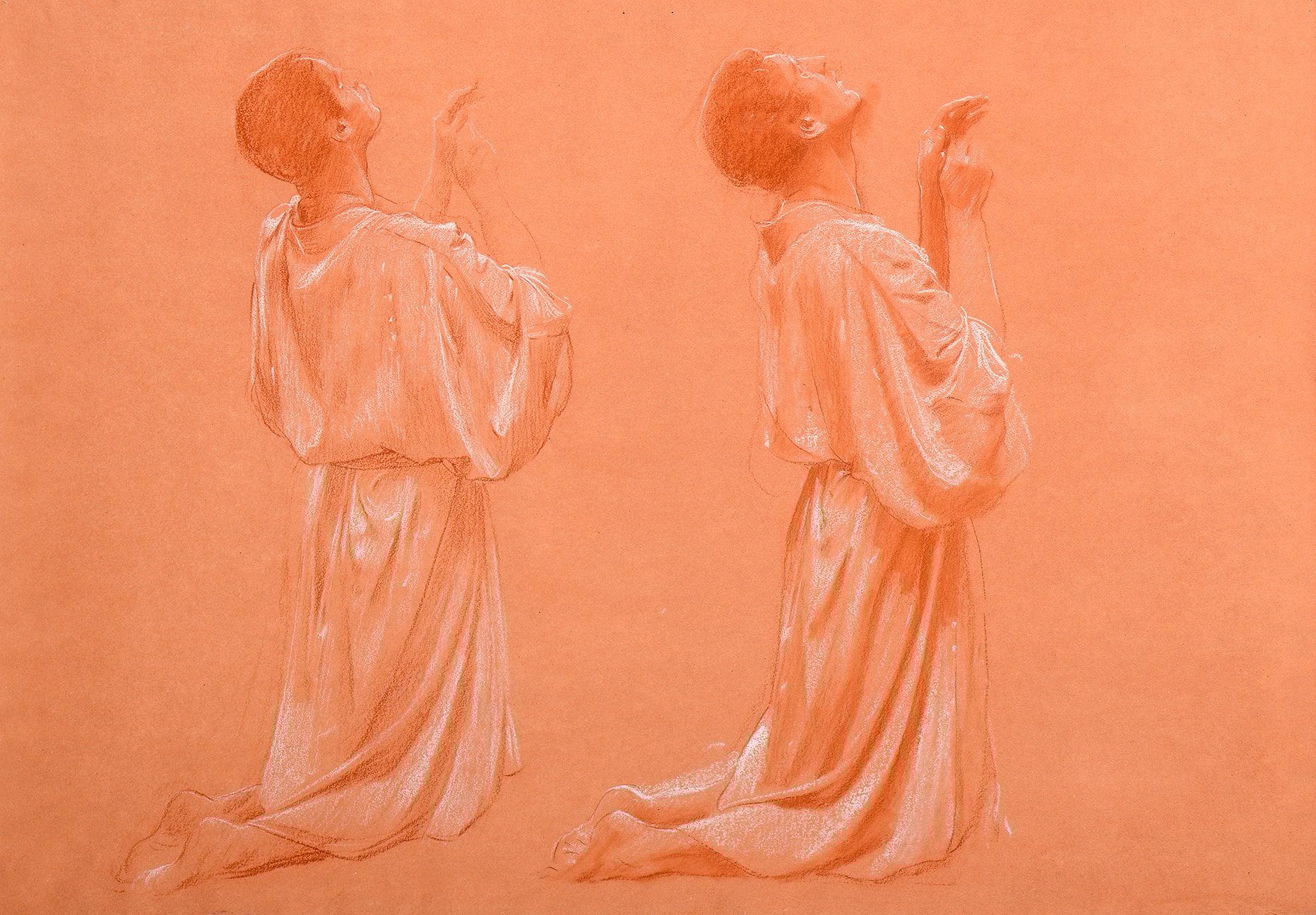 Red and white chalk on reddish-orange paper.