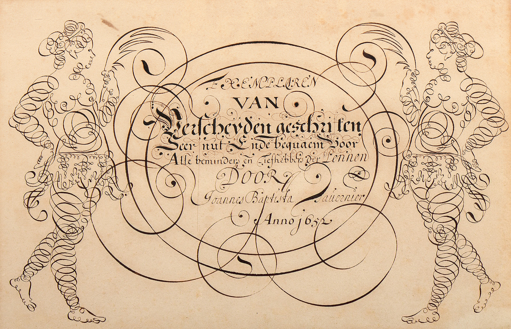 Inscribed, signed and dated 'EXEMPLAREN / VAN / Verscheyden geschriften / Seer nut in de bequaem voor / Alle beminders en Liefhebbers der Pennen / DOOR / Joannes Baptista Tavernier / Anno 1652' in the centre.