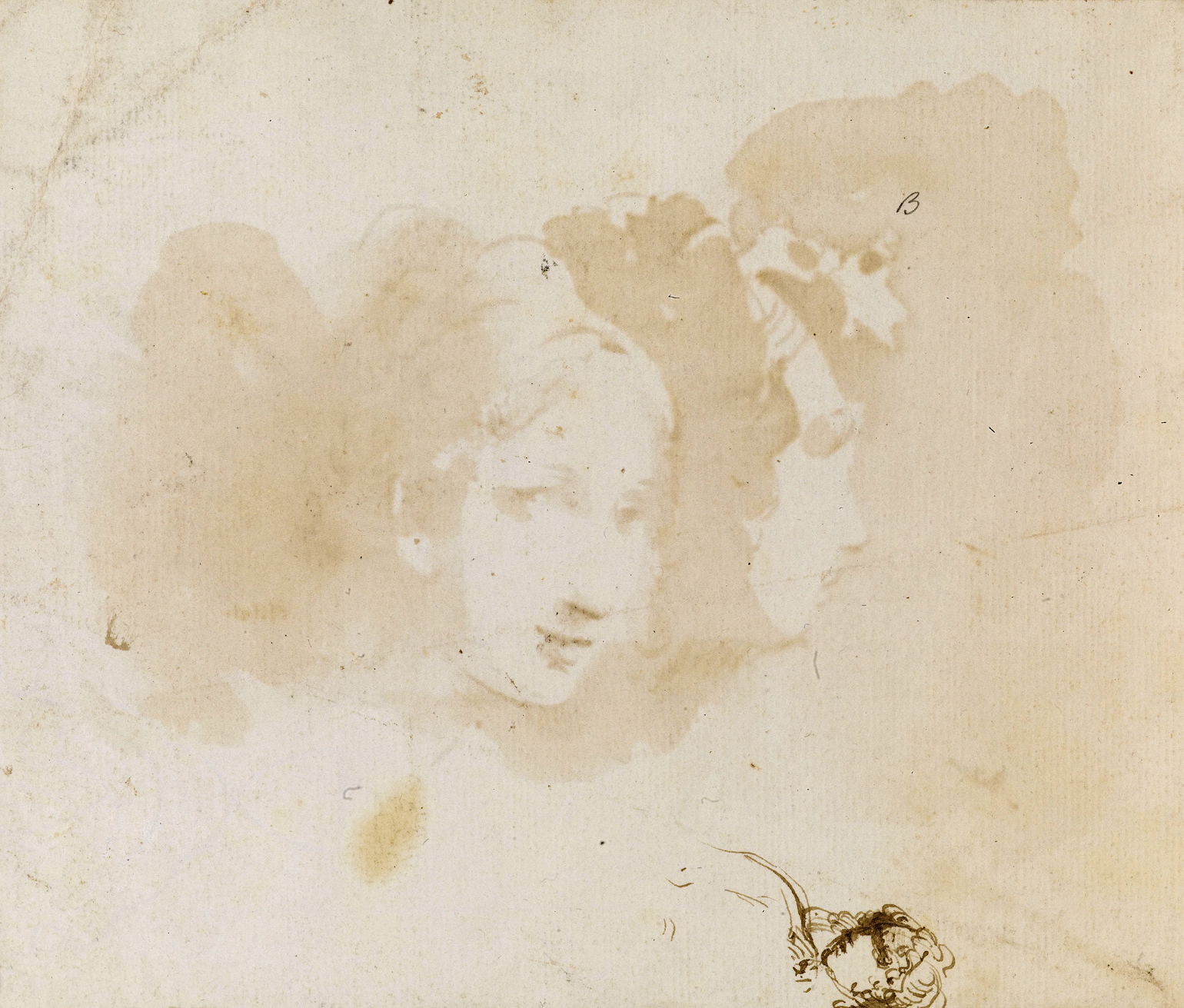 A small sketch of the head of a young woman in pen on the verso.