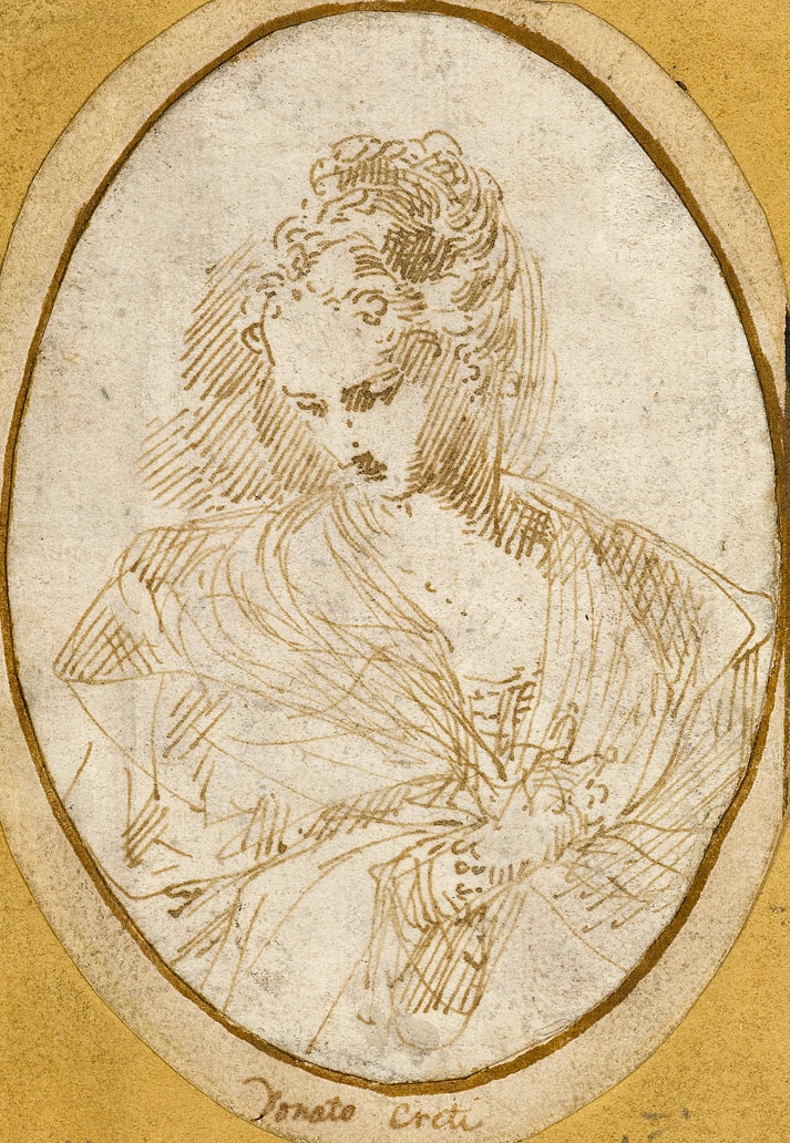 In his biography of the artist, Giampietro Zanotti writes that Creti’s drawings were highly regarded by his contemporaries. (The painter Marcantonio Franceschini, for one, praised the artist as a ‘grandissimo disegnatore’.) He learned to draw from the nude in the studio of Pasinelli, and in general preferred to use pen and ink wash for his studies, drawn with a rapid, calligraphic stroke, although he also produced head studies in chalk. Landscapes, figure studies and portraits make up the bulk of Creti’s drawings, many of which, according to Zanotti, were given away as presents by the artist.