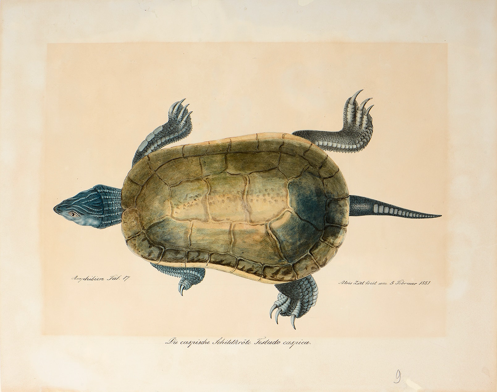 Signed and dated Alois Zötl fecit am 5 Februar 1881 at the lower right. Inscribed Amphibien Taf.17 at the lower left, and titled Die caspische Schildkröte Testudo caspica. in the bottom margin.