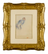 This lively watercolour is a preparatory study for the figure at the left of Renoir’s painting Bathers in the Forest of c.1897 in the Barnes Foundation in Merion, Pennsylvania, a painting executed some ten years after the Great Bathers. In the Barnes canvas, more loosely painted than its larger predecessor, Renoir adapted the formal grandeur of the Great Bathers into a more casual idiom. As John House has noted of the Barnes painting, ‘in contrast to the stiffness and stillness of the figures in the earlier canvas, the figures are far more animated and the softly brushed paint-handling gives the whole canvas a sense of movement and energy.’ Like the Great Bathers, the composition of the Bathers in the Forest appears to have been similarly inspired by the Baroque sculptor François Girardon’s lead bas-relief frieze of bathing nymphs on the wall of a fountain and pond at one end of the Allée d’Eau at Versailles.