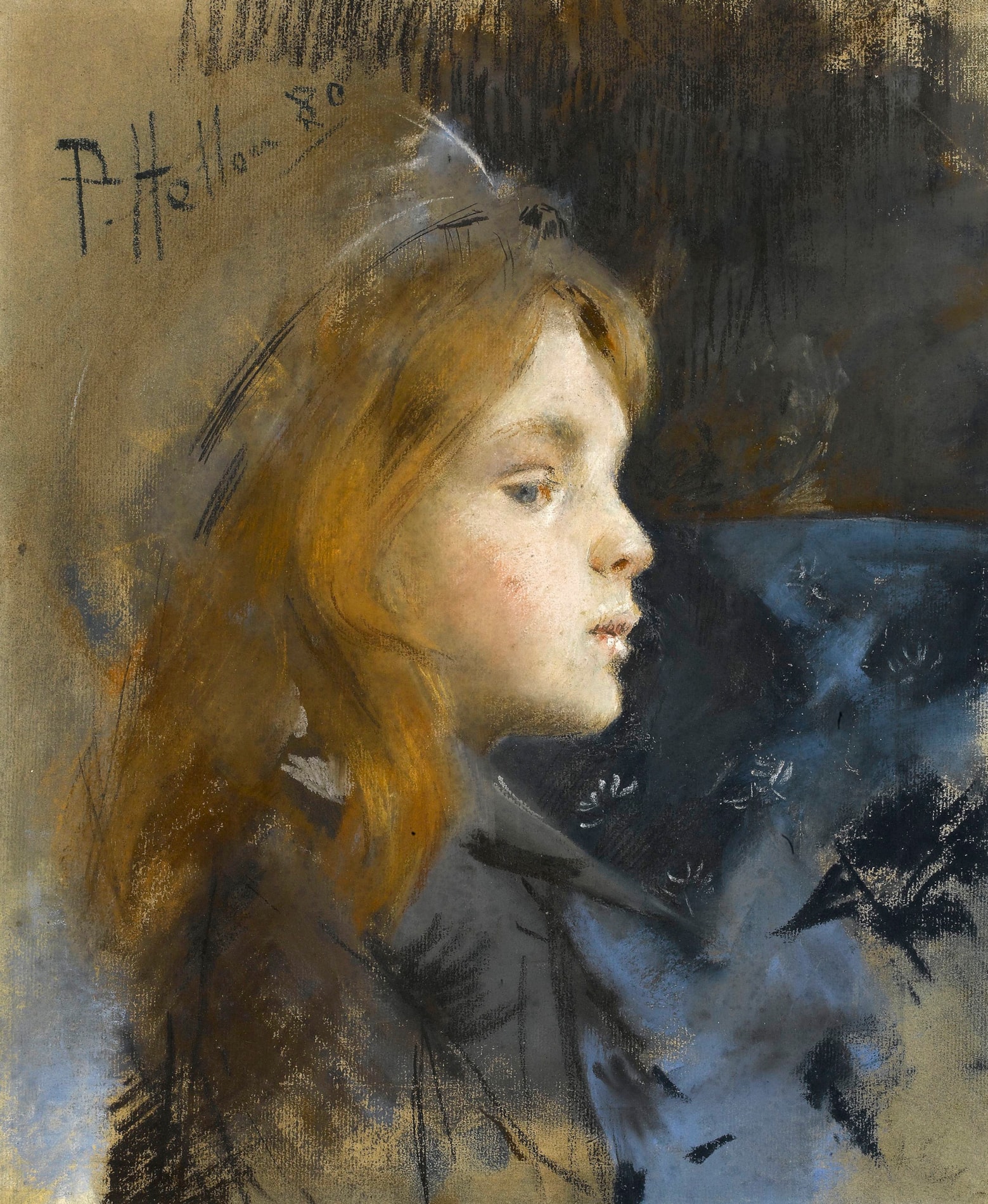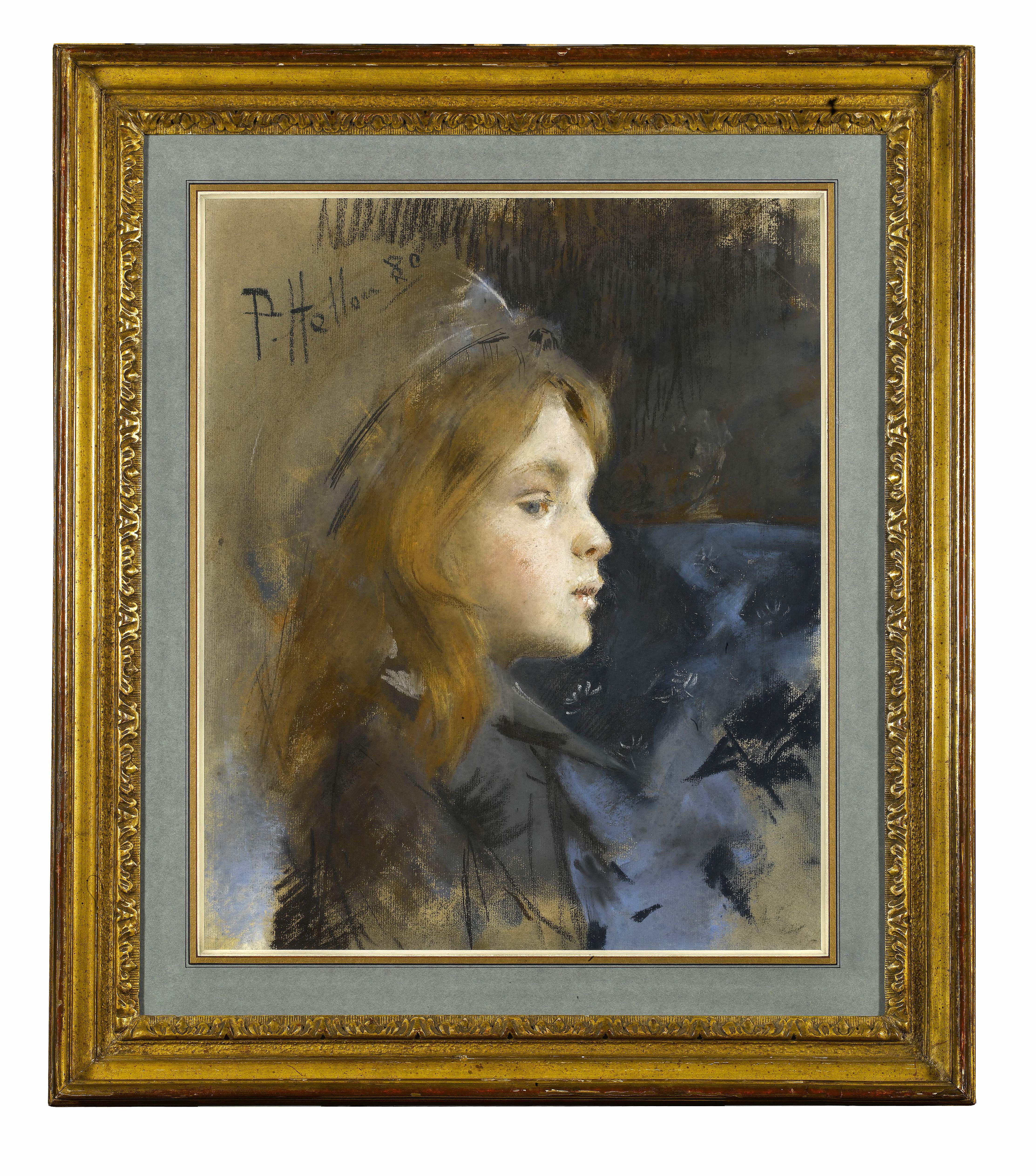 The striking red hair of the sitter in this pastel portrait is a favourite motif of the artist (the critic Félix Fénéon once noted of Helleu that ‘like M. [Albert] Besnard he delights in the prestige of red hair’), and the appearance of this young girl is in fact reminiscent of Helleu’s favourite model, his wife Alice Guérin, whom he married in 1886 when she was sixteen years old. There is indeed a strong resemblance between the girl depicted in this pastel and Helleu’s later portraits of Alice, who would have been ten years old at the time this pastel was drawn. However, the artist is not thought to have met Alice until several years later, in 1884. This is the date of the earliest known pastel portrait of her by Helleu; commissioned by her parents, M. and Mme. Louis-Guérin, it is today in the Musée Bonnat in Bayonne.