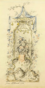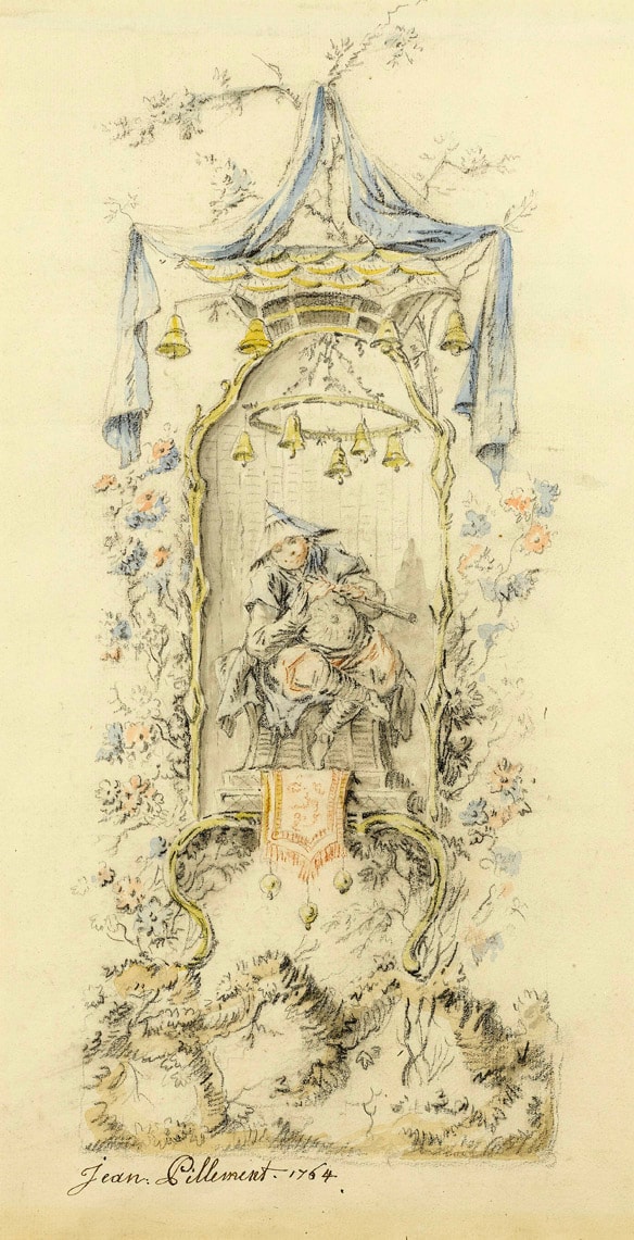 This delightful sheet, signed in full and dated 1764, is likely to have been produced as a collector’s drawing in its own right. However, a very similar compositional arrangement, with four Oriental musicians – each depicted seated on platforms beneath a canopy hung with bells and surmounted by a blue cloth - appears in Pillement’s painted chinoiserie decoration of a large hall in the palace of Schloss Niederweiden in Austria, commissioned by the Empress Maria Theresa around 1764 and completed by the spring of the following year. As a recent scholar has described the room, ‘Between the windows, surrounded with flower-covered trelliswork, four large chinoiserie figures appear on each side of the room seated on ornate platforms within a frame of draperies adorned with bells and surmounted by canopies surrounded by a profusion of climbing flowers.’