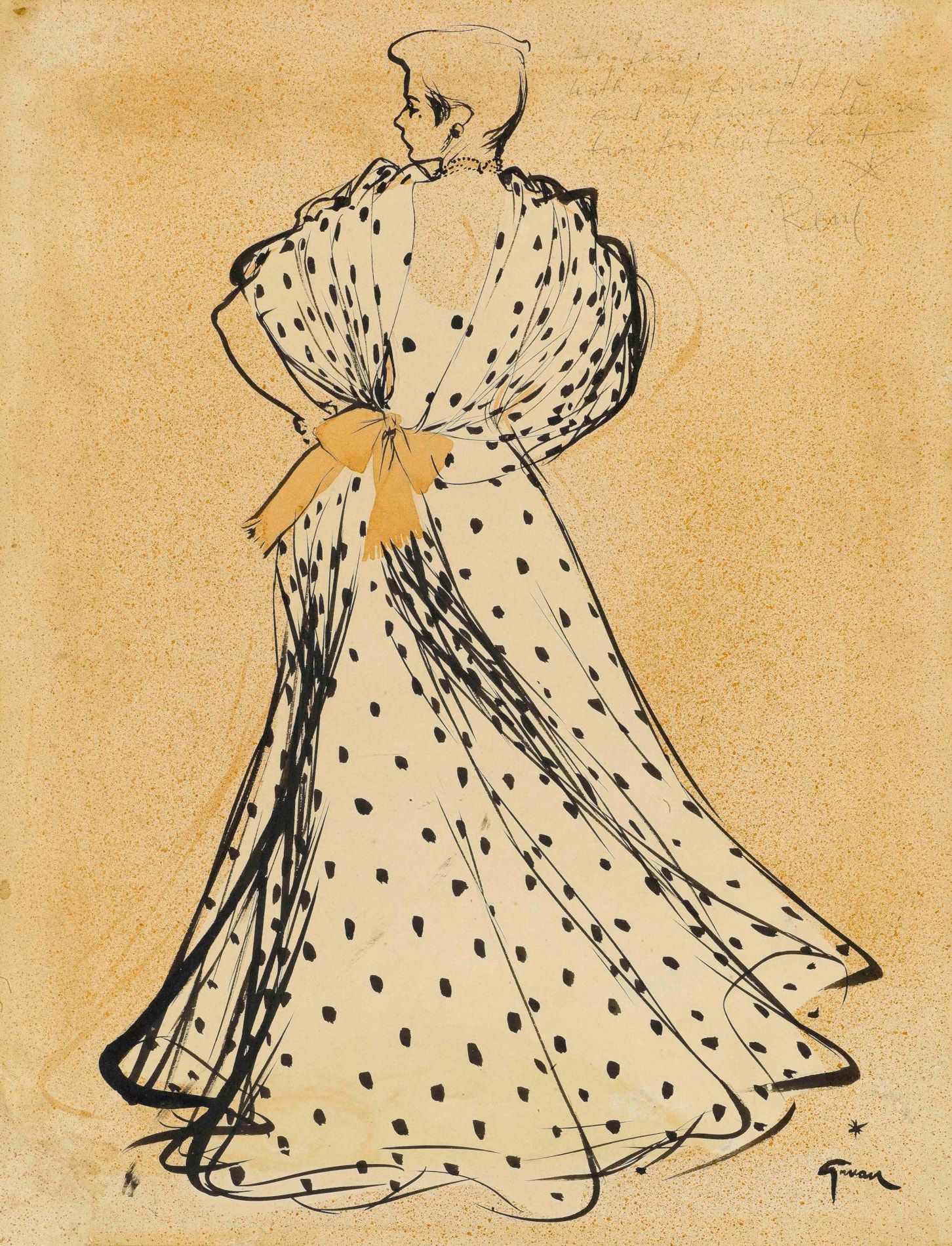 Born to an Italian nobleman and a French mother in Covignano, near Rimini, Renato Zavagli Ricciardelli, Conte delle Camminate, enjoyed a life of luxury as a child, living between Rimini, Milan, Paris and Monte Carlo. He displayed an innate talent as a draughtsman from an early age and, adopting his mother’s maiden name of Gruau, embarked on a career as an illustrator while still in his late teens. Settling in Paris in the early 1930’s, he soon found employment providing drawings of the latest fashions for the newspaper Le Figaro and the fashion magazine Femina. He also recorded the collections of such Parisian designers as Pierre Balmain, Jacques Fath, Jeanne Lanvin, Jean Patou, Elsa Schiaparelli, Cristobal Balenciaga and, in particular, Christian Dior, who was a close friend. Gruau worked closely with the couturier, designing numerous advertisements and posters for the atelier. Indeed, Gruau may be said to have helped to shape, to a large extent, the public image of the house of Dior, particularly during the period of the fashion designer’s brief independent career, between 1947 and his death ten years later.