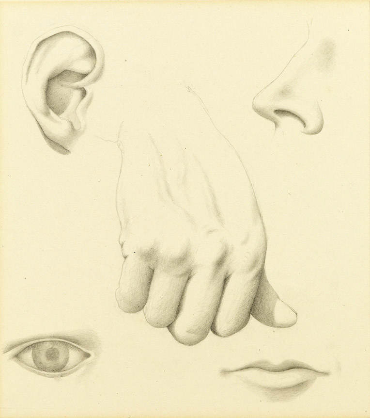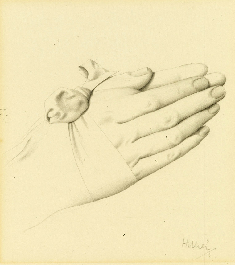 Jenny Pery, in her recent monograph on Hillier, describes the origins of this series of drawings in more detail: ‘Hillier’s delicate drawings, full of spirituality, made to illustrate the Seven Sacraments (1956-57) are all of hands engaged in the sacramental rites. The hand representing Baptism holds a jug, Confirmation is portrayed as an outstretched hand, Penance is a single upright hand, Eucharist a pair of hands holding a chalice, Extreme Unction a downward-pointing hand surrounded by an eye, ear, nose and mouth, Ordination a pair of hands knotted together and Marriage links two hands with a ring. Some of these were studies of the hands of Christopher Leyne, then art master at Downside, who in 1956 had suggested that his promising pupil Rob Stuart should take private lessons from Hillier. As Leyne wrote to Stuart: ‘Tristram, who has been up in the Attic quite a lot doing some drawings of my hands to help illustrate the Seven Sacraments, is very keen on the student having only one master.’ Hillier’s only pupil, Stuart was initially sent from Downside for weekly tutorials in Hillier’s studio, later confessing that these lessons terrified him. He did not become a ‘follower’, eventually abandoning painting in favour of picture dealing while remaining a friend and confidant. The exalted, prayerful quality of the Seven Sacraments drawings can hardly be missed. Perhaps they were an impossible act for a student to follow.’