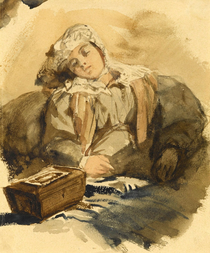 This charming small watercolour may be grouped with a handful of other drawings of a young woman, wearing a cap or bonnet, of around 1827-1828. These late works by Bonington include four pen and ink drawings in the collections of the National Gallery of Victoria in Melbourne, the Ashmolean Museum in Oxford and the Yale Center for British Art in New Haven, CT, as well as pencil studies of what appears to be the same sitter in the Yale Center for British Art, the Wadsworth Atheneum in Hartford, CT., and a private collection in Paris.