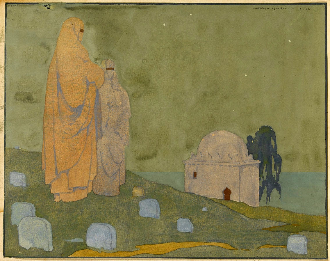 The present sheet is dated May 1922, when Mercier was twenty-three years old. It is interesting to note that the young artist was visiting Morocco only a decade or so after the country had been opened up to foreign visitors. Unlike Tunisia or Algeria, Morocco remained largely closed to foreigners throughout the 19th century, until it was declared a French and Spanish protectorate in 1912. The French decided to move the capital from Fez to Rabat, a port town dominated by Barbary pirates since the 17th century. This drawing appears to depict a small cemetery on the Atlantic coast of Rabat, just north of the Kasbah des Oudaïas and to the north and east of the larger Cimitière As-Shouhada.