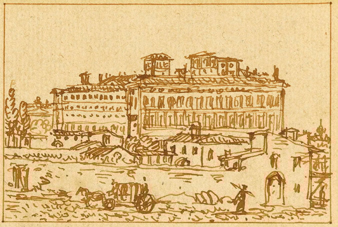 Nicolle would make drawings sur le motif in pen and ink, which he would then finish with watercolour in his studio. Although best known for his Roman views, Nicolle also produced drawings of other cities in Italy (including Bologna, Venice, Verona, Naples and Florence), while in France he made numerous studies of Paris and its environs. Although he never exhibited at the Salons, his reputation as a topographical artist was such that in 1810 he received a commission from Napoleon for fifty watercolour views of the principal monuments of Paris, intended as a wedding present for the Empress Marie-Louise and now at Malmaison. Other significant groups of drawings by Nicolle are today in the Louvre, the Musée Carnavalet and the Bibliothèque Nationale in Paris, as well as the museums of Rouen and Lille.
