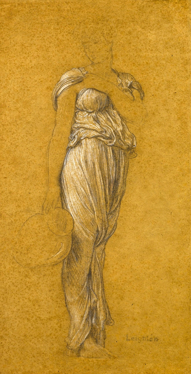 This large sheet is a study for the drapery of one of the woman drawing water from a well at the right-hand side of Leighton’s large painting of Captive Andromache, today in the collection of the Manchester City Art Galleries. Over four metres in length, the painting was the largest work of the artist’s late period. It was exhibited at the Royal Academy in 1888. Andromache was the loyal wife of the Trojan prince Hector. Following her husband’s death and the fall of Troy, she was taken as a concubine by Neoptolemus, ruler of Epirus. Leighton’s painting depicts the mourning Andromache standing among the women of Epirus, waiting for her turn to draw water from a well. Leighton’s painting of Captive Andromache was purchased by the Manchester Art Gallery in 1899 for the considerable sum of four thousand pounds, raised by public subscription.