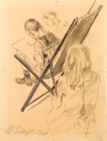 Born in Bublitz in Pomerania (now Bobolice in Poland), Max Seliger was active as a painter, decorator, mosaicist and lithographer. He remains little known outside of Berlin and Leipzig, where he worked for most of his life, and there appear to have been no monographs or exhibitions dedicated to the artist. Early in his career, in 1893, Seliger received the commission for what is probably his best-known work; the decoration of the façade of the German pavilion, the Deutsches Haus, at the World’s Columbian Exposition in Chicago. Another significant public commission he earned was for a series of mural paintings to decorate the former Royal Gymnasium, or school, in the town of Wurzen in Saxony. Seliger also established a particular reputation as a designer of mosaic decorations. These include a series of mosaics painted for the Kaiser Wilhelm Memorial Church in Berlin in 1903-1904, while on a more intimate scale is his mosaic on the tomb of his young nephew Fritz Dernburg in the Berlin cemetery of Grunewald, which was completed in 1895.
