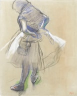 When the Metropolitan Museum Dancers in the Rehearsal Room with a Double Bass was exhibited in London in 1891, a few years after it was painted, the Irish author and critic George Moore, a friend of the artist, noted of this particular figure that ‘the girl next to [the seated foreground dancer] a little higher up the picture, with light falling on her shoes – she is examining them – occurs in nearly every Leçon de Danse that Degas has painted; she is one of his stock figures, we find her everywhere, by herself and forming part of almost every group.’ While this figure is not quite as ubiquitous in Degas’ work as Moore would suggest, a number of other drawings of this dancer are known. These include a sketchier charcoal study of the whole figure, squared for transfer, in the Hyde Collection in Glen Falls, New York, and a study of her head, looking downwards, in a drawing formerly in the Koenigs collection and now in the Jean Bonna collection in Geneva. Variants of this pose are also found in a handful of other drawings and pastels by Degas, while the same figure appears, in reverse, with a group of other dancers in a finished pastel in the National Gallery of Ireland in Dublin.