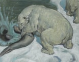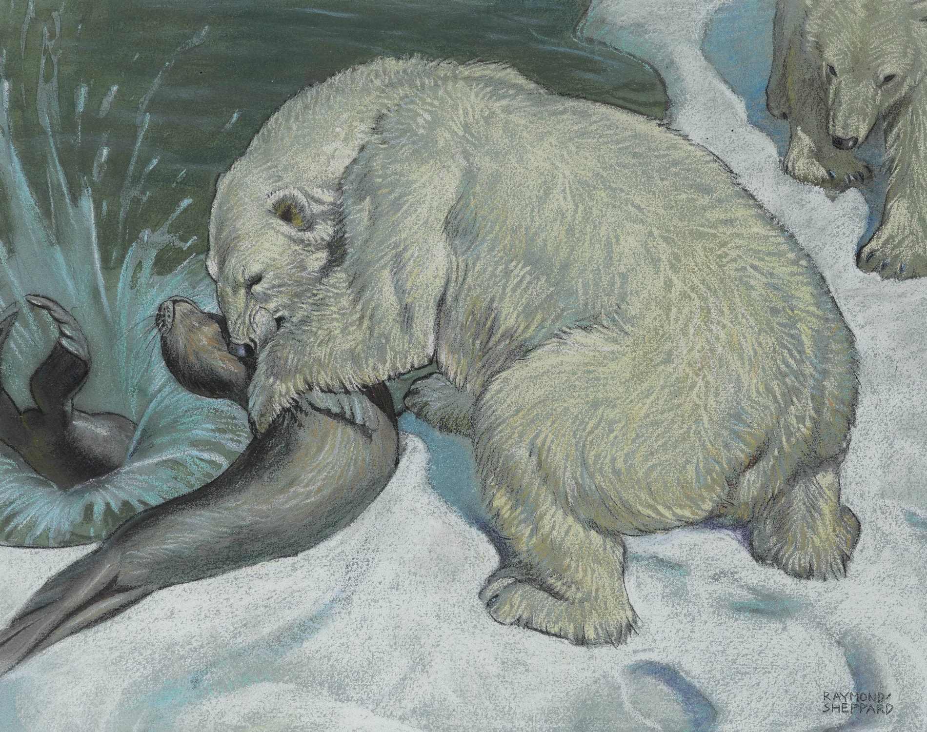 This striking study of a polar bear and seal is a splendid example of Sheppard’s abilities as a wildlife artist, and of his mastery of the pastel medium. His natural rendering of the polar bears and their power over the seals is simply yet assuredly drawn, and with a few flicks of pastel he has captured the strength and beauty of these powerful creatures. Polar bears seem to have been a particular favourite subject of the artist, while further studies of seals can be found in Rowena Farre’s Seal Morning, one of the many books illustrated by Sheppard, which includes several charming sketches of seal pups and their mothers.