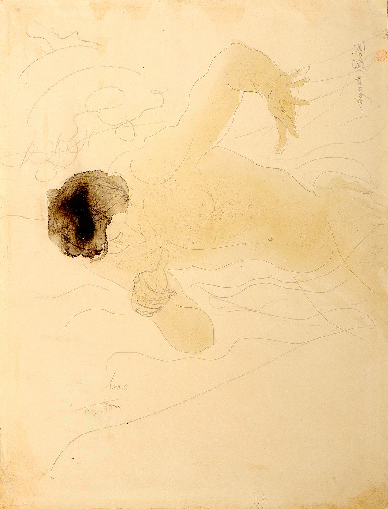 In 1903, the writer Clément Janin provided a fascinating description of Rodin’s method of drawing at this late stage in his career: ‘In his recent drawings, Rodin uses nothing more than a contour heightened with a wash. Here is how he goes about it. Equipped with a sheet of ordinary paper posed on a board, and with a lead pencil – sometimes a pen – he has his model take an essentially unstable pose, then he draws spiritedly, without taking his eyes off the model. The hand goes where it will: often the pencil falls off the page...The master has not looked at it once. In less than a minute, this snapshot of movement is caught. It contains, naturally, some excessive deformations, unforseen swellings, but, if the relation of proportions is destroyed, on the other hand, each section has its contours and the cursive, schematic indication at its modelling...The first effort completed, Rodin takes up the work again, sometimes corrects it directly with a stroke of red pencil; but most often, it is in tracing that he rectifies it. His great preoccupation at this time is to conserve and even to amplify the impression of life that he has obtained from the direct sketch...The tone that he adds, this wash of Sienna that goes over the limits of the line, seems capricious or negligent, and has, in reality, the effect of thickening this enlargement, as well as binding together the contours.’