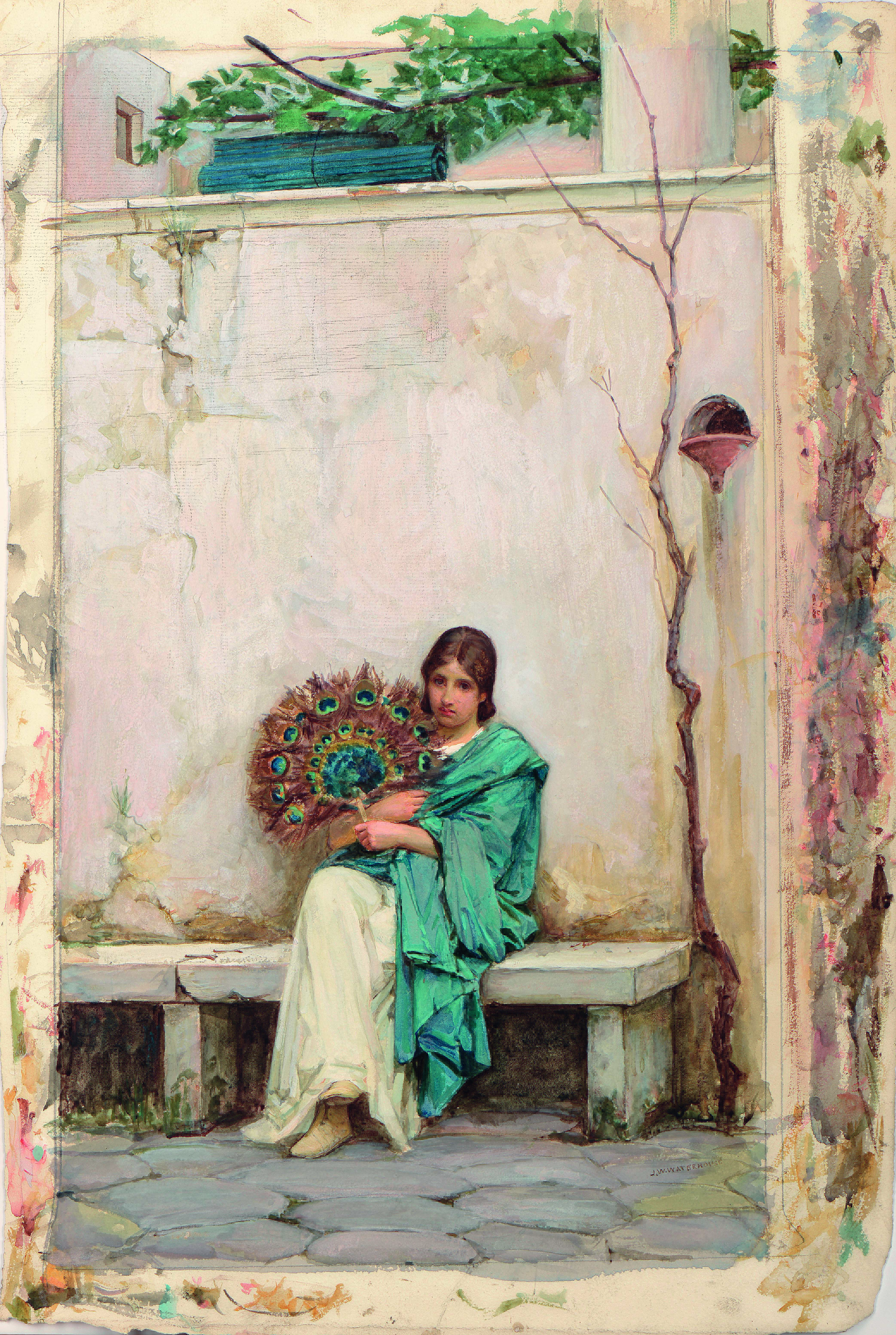 Between 1877 and his marriage in 1883 Waterhouse made several trips to Italy, and this charming watercolour would seem to have been inspired by his travels. Sent by the artist to the annual watercolour exhibition at the artist-run Dudley Gallery in London in 1879, the present sheet was singled out in a review in The Illustrated London News, which noted that ‘Delicate artistic qualities are noticeable in “Day Dreams” (615), by J. W. Waterhouse – an Italian girl seated against a white wall, holding a fan of peacock’s feathers.’ Long thought to be lost and only recently rediscovered, this watercolour has remained unseen since the Dudley Galley exhibition in 1879.