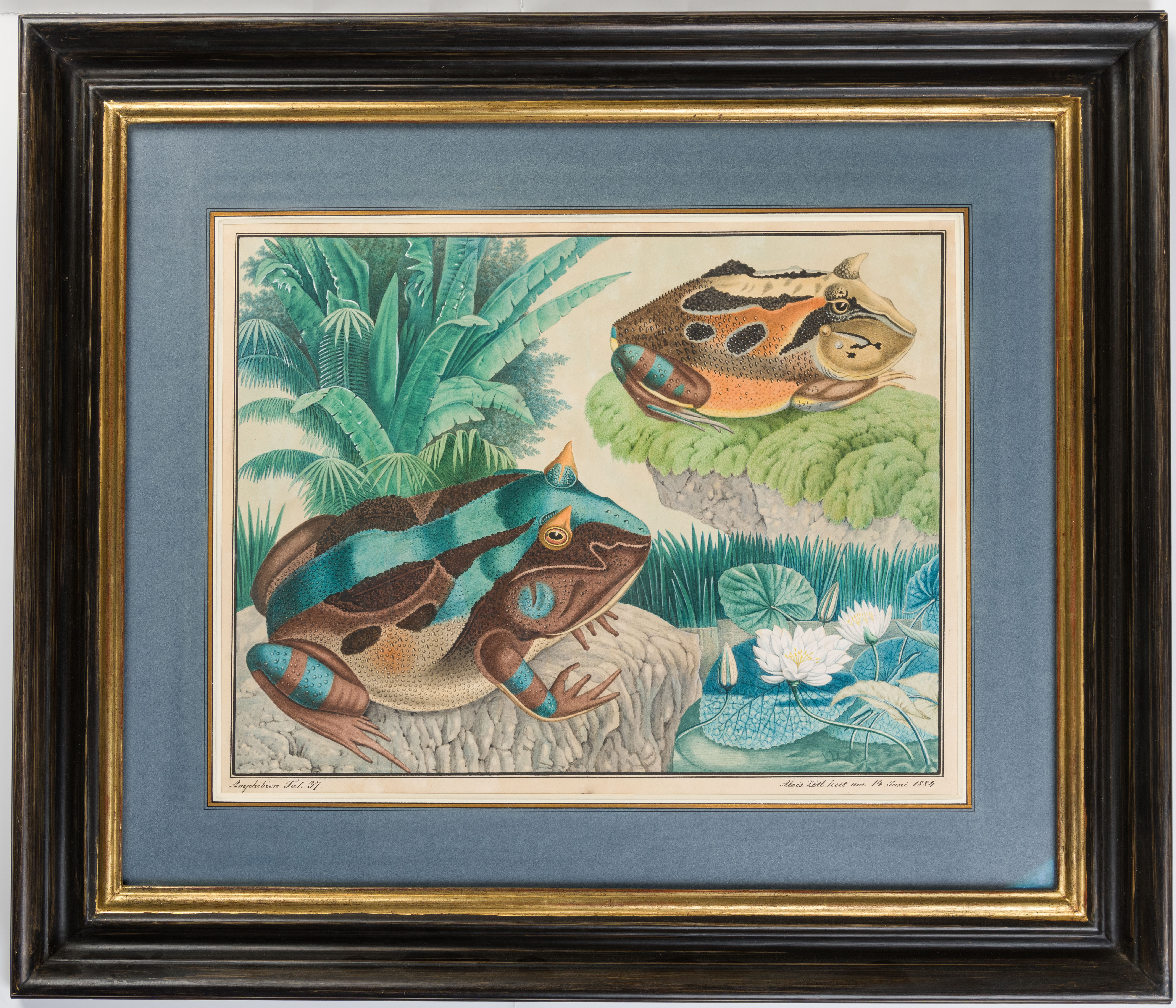 Inscribed Amphibien Taf.37 at the lower left margin. Further inscribed Weibchen, Die Hornkröte. Rano cornuta. and Mänchen. in the bottom margin.