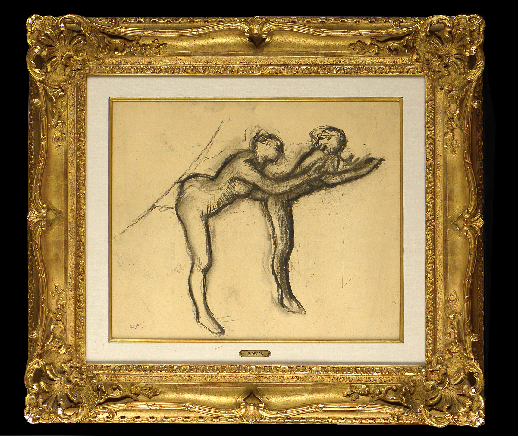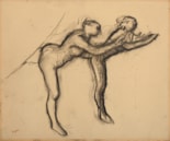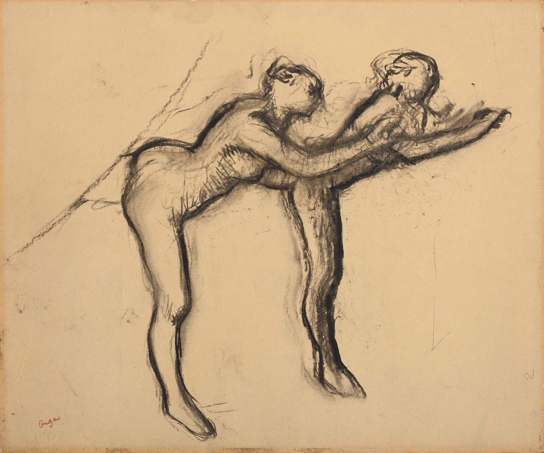 The ballet pose depicted in this drawing is part of an ‘arabesque penchée’, in which the dancer begins by standing erect and then slowly tilts her body forwards while raising and extending one leg behind her. This is the same movement captured in a series of three sculptures by Degas, modeled by the artist in wax between 1882 and 1895 and cast in bronze after his death, depicting a nude in three phases of the arabesque4. The pose of the two dancers in this drawing is very close to one of these sculptures, the Grand Arabesque, Second Time (Grande arabesque, deuxième temps), and Degas is likely to have used the wax model as the inspiration for the drawing.