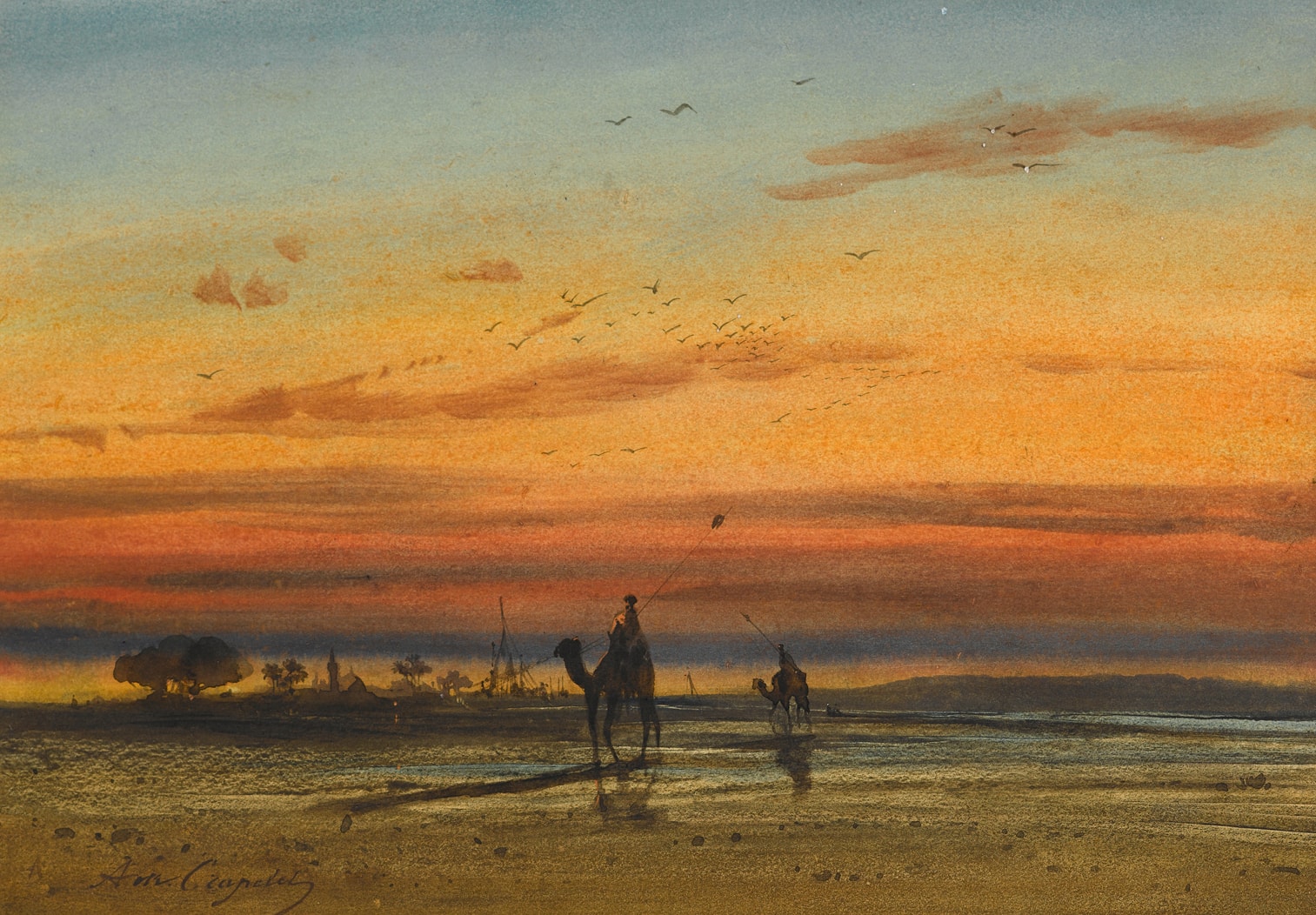 Louis-Amable Crapelet was particularly admired for his atmospheric watercolours of Oriental subjects, of which the present sheet is a fine example. As the Orientalist scholar Emily Weeks has noted, ‘In the nineteenth century, watercolour had developed into a highly-portable and fat-drying medium, making it a favourite among travelling artists...Watercolour also, in the opinions of its champions, perfectly captured the particular qualities of light and air, the vibrancy, and the almost palpable sense of energy that the Middle Eastern landscape offered. Crapelet’s work, which shifts between transparent washes of colour and the more concentrated application of luminous pigments, well conveys this.’