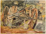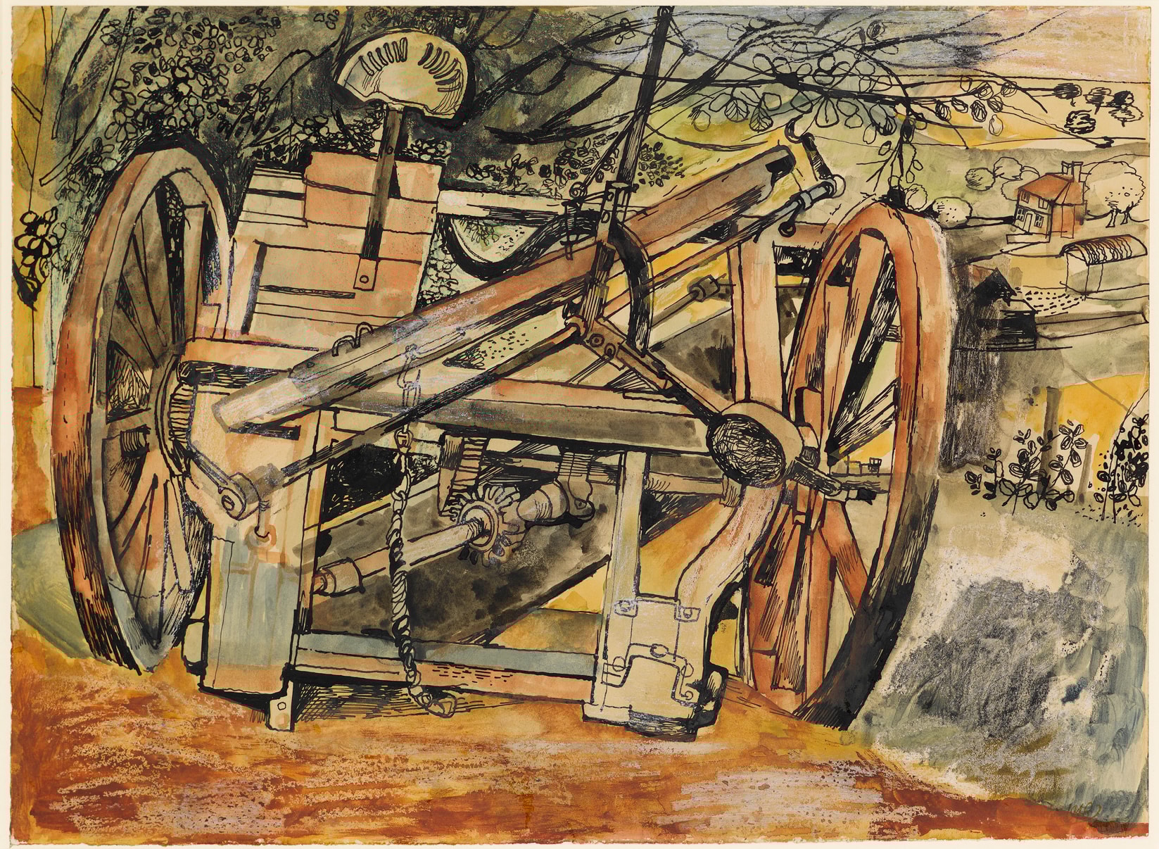 Many of John Minton’s drawings and watercolours of the late 1940’s depict farms and record farming practices that were soon to be mechanized, or pieces of farm machinery that were no longer in use. The actual type and purpose of the machine depicted in this large watercolour cannot easily be determined; it appears to be a sort of drill or perhaps a fertiliser distributor. The artist may have chosen to draw only parts of the machine, or else may here depict a piece of equipment which may have been adapted by a farmer for a specific purpose.