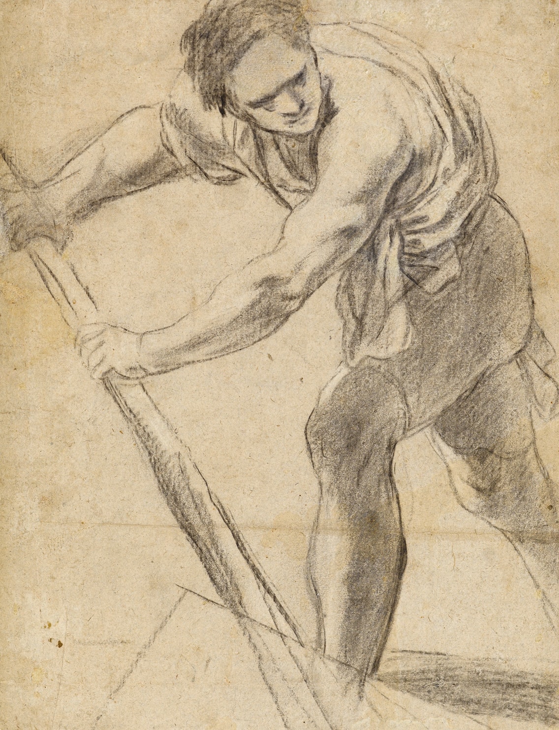Black chalk, heightened with touches of white chalk, on pale blue-grey paper.
