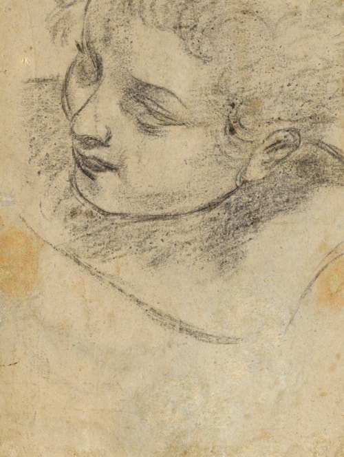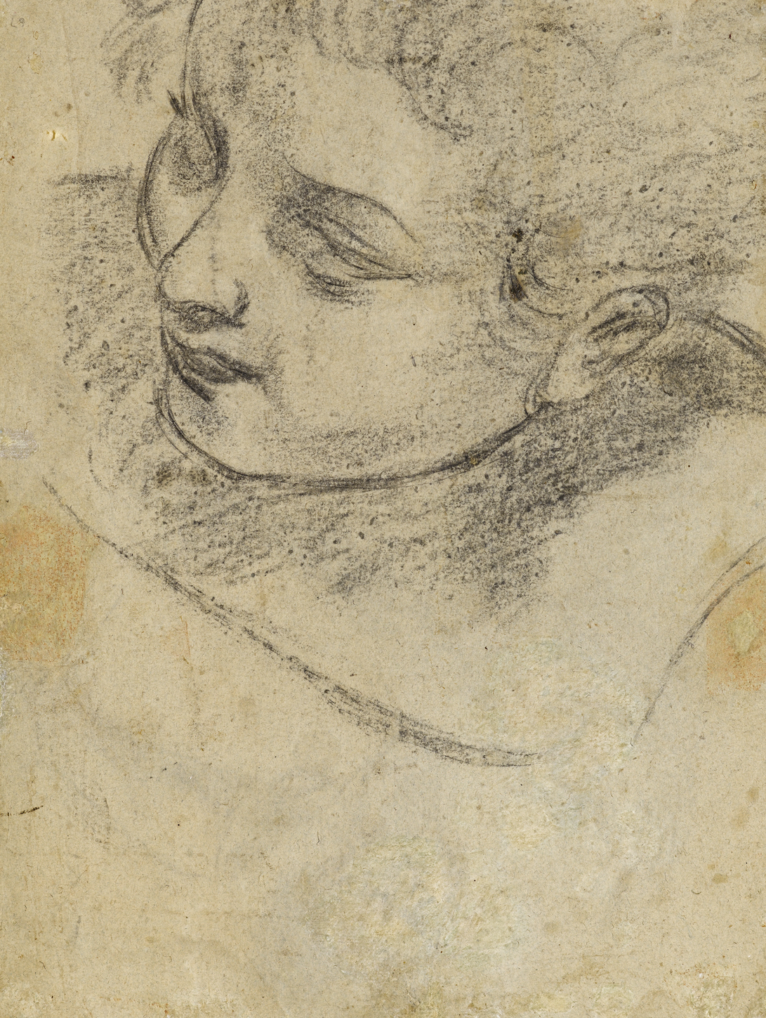 Cavedone’s drawings display a distinctive combination of Venetian and Bolognese elements, with the particular influence of the draughtsmanship of Titian on the one hand and Ludovico Carracci on the other. His drawings may be divided into three main groups - compositional sketches, figure and drapery studies, and large studies of individual heads - and approximately half of his surviving drawings may be related to extant paintings. While his composition drawings were generally drawn in pen and ink wash, for figure and head studies he tended to use either a soft black chalk, usually applied on blue paper, or charcoal heightened with white chalk on light brown (and sometimes oiled) paper. (Cavedone’s drawings of this latter type were to be a strong influence on Guercino’s draughtsmanship.) The largest and most important single group of drawings by Cavedone, numbering just under seventy sheets, is in the collection of the Royal Library at Windsor Castle.