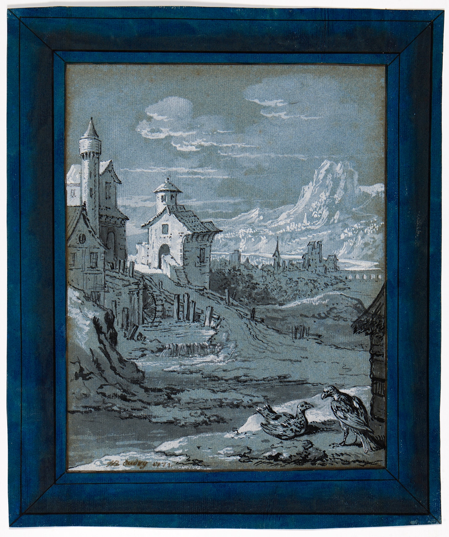 The fable depicted in this drawing is taken from Book IX, Fable II. Two pigeons (the birds have sometimes later been described as doves) live together in friendship, but one longs for adventure and to explore the wider world. Despite the protestations of his companion, who fears for his safety, he eventually flies off on what he believes will be a short voyage of just three days, after which he promises to return to regale his friend with tales of his grand adventures. During his travels, however, the pigeon is trapped in a rainstorm without shelter, caught in a net from which he just manages to escape, is then attacked by a vulture and finally is injured by a boy with a sling. The pigeon returns home ‘half dead, half crippled’ to rejoin his friend, and vows never to roam again. La Fontaine’s fable was adapted as a ballet with music, entitled Les deux pigeons, by André Messager in the late 19th century, and choreographed anew by Frederick Ashton in 1961.