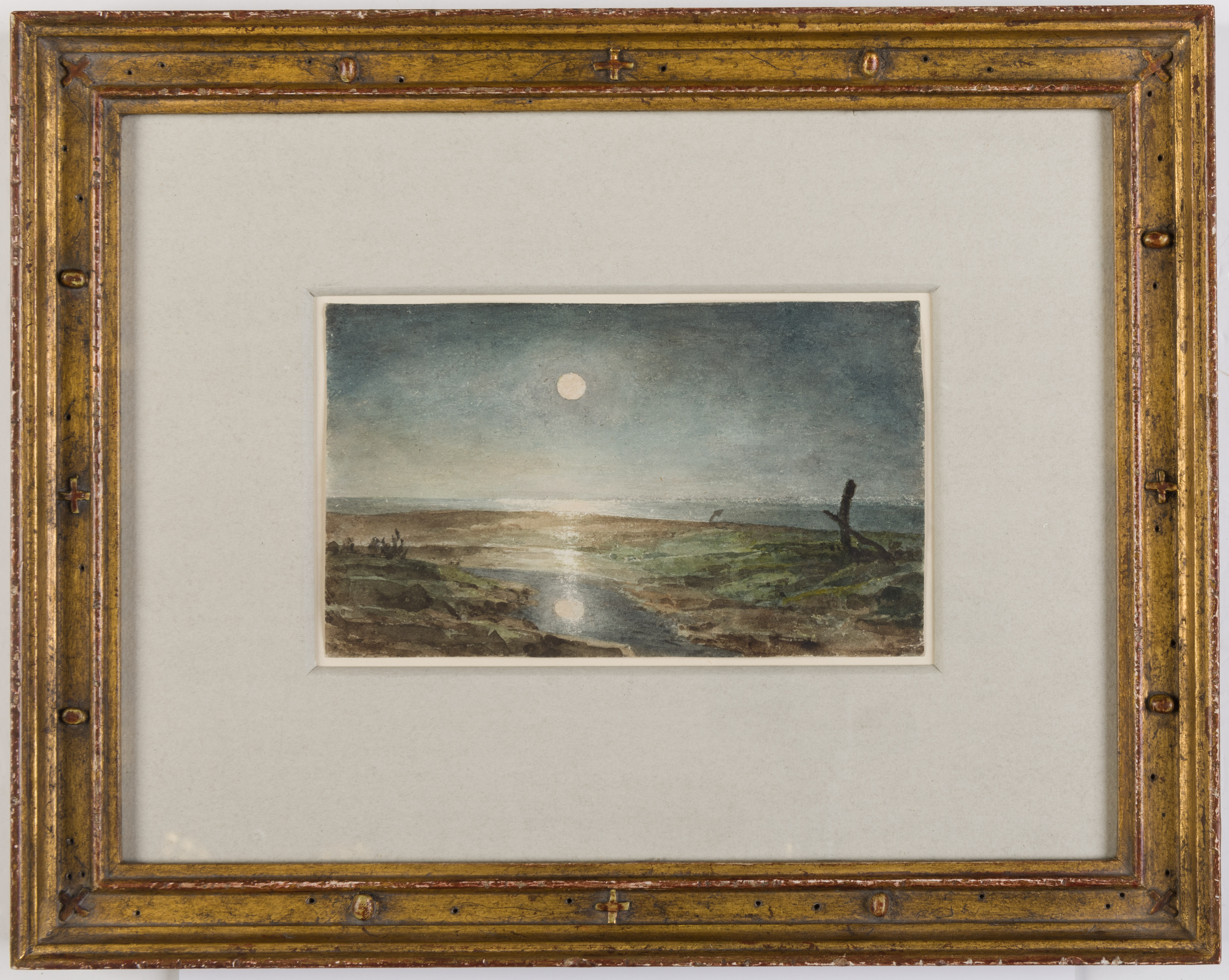 The present sheet was one of several landscape sketches by Gandy from the 1820’s which were acquired from him by his friend, the Neoclassical sculptor Sir Richard Westmacott (1775-1856). Westmacott had studied in Rome with Gandy, and sometimes purchased works from his often impecunious friend. He later assembled these watercolours into two albums which he gave to his daughter Maria Poole. One of these albums is today in the Sir John Soane Museum in London, while the other album was eventually broken up and the drawings dispersed in 2004. The present sheet was part of this second album, which was titled GANDY / VOL II / LANDSCAPE on the spine, and inscribed, by Richard Westmacott, Gandy’s sketches / I give / Maria on the inside cover. The album contained 97 watercolours of landscapes and studies from nature, variously inscribed and dated between the 15th of July 1820 and the 5th of July 1826. The album contained watercolour landscapes drawn in London and its outskirts, as well as various views in Surrey, East and West Sussex, and Kent on the southeast coast of England, as well as a number of studies of skies, clouds, sunsets, storms and nocturnal views. Many of the watercolours – which appear to have come from one or more sketchbooks used by the artist - were inscribed by Gandy with the location, date and time that the views were made, as well as the compass direction of the view chosen.