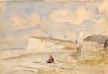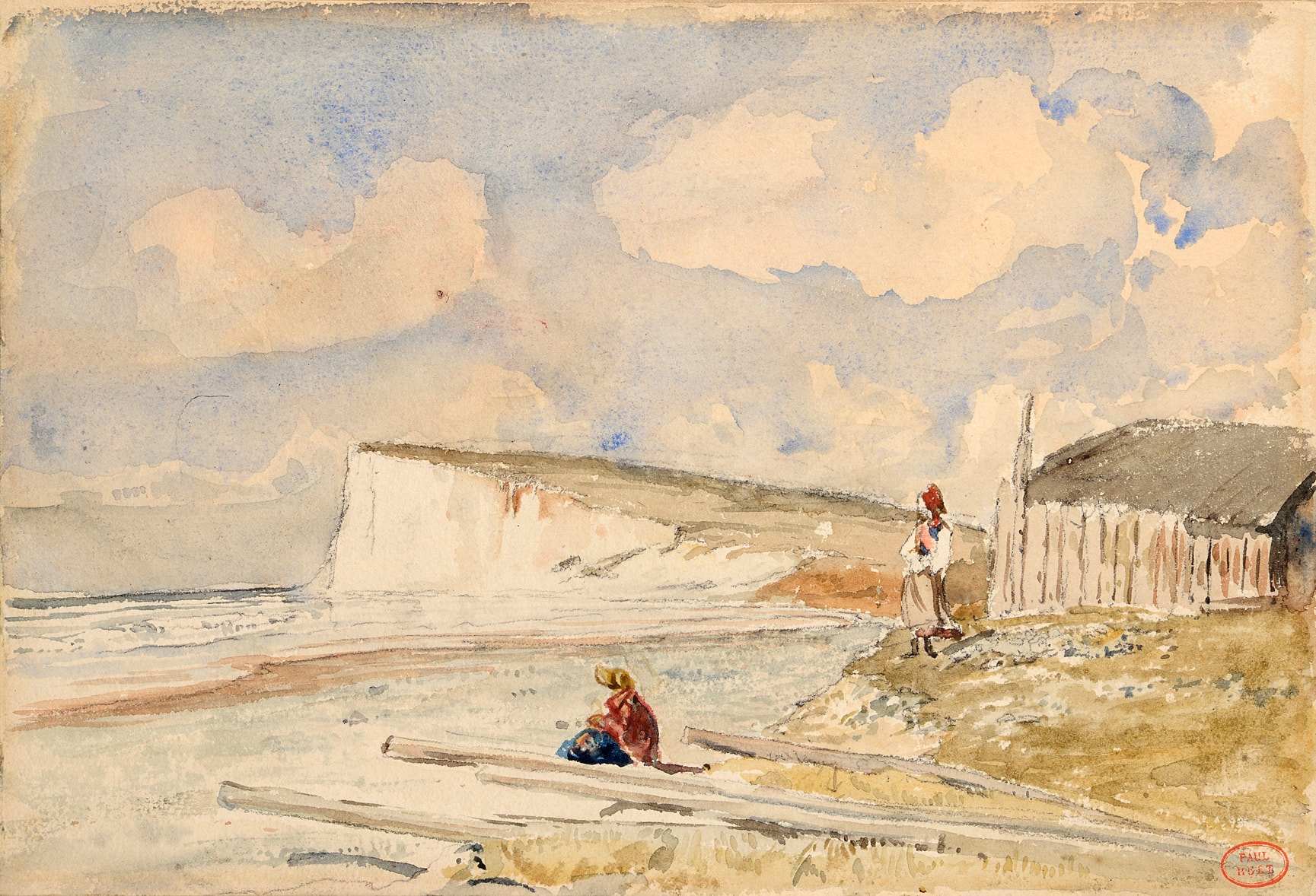 Inscribed (in a modern hand) Paul Huet (1803-1869) / “Falaises et nuages ensoleillés” / (Mme Paul Huet et la femme de pêcheur) / (26-19) and numbered No.14 on the backing board